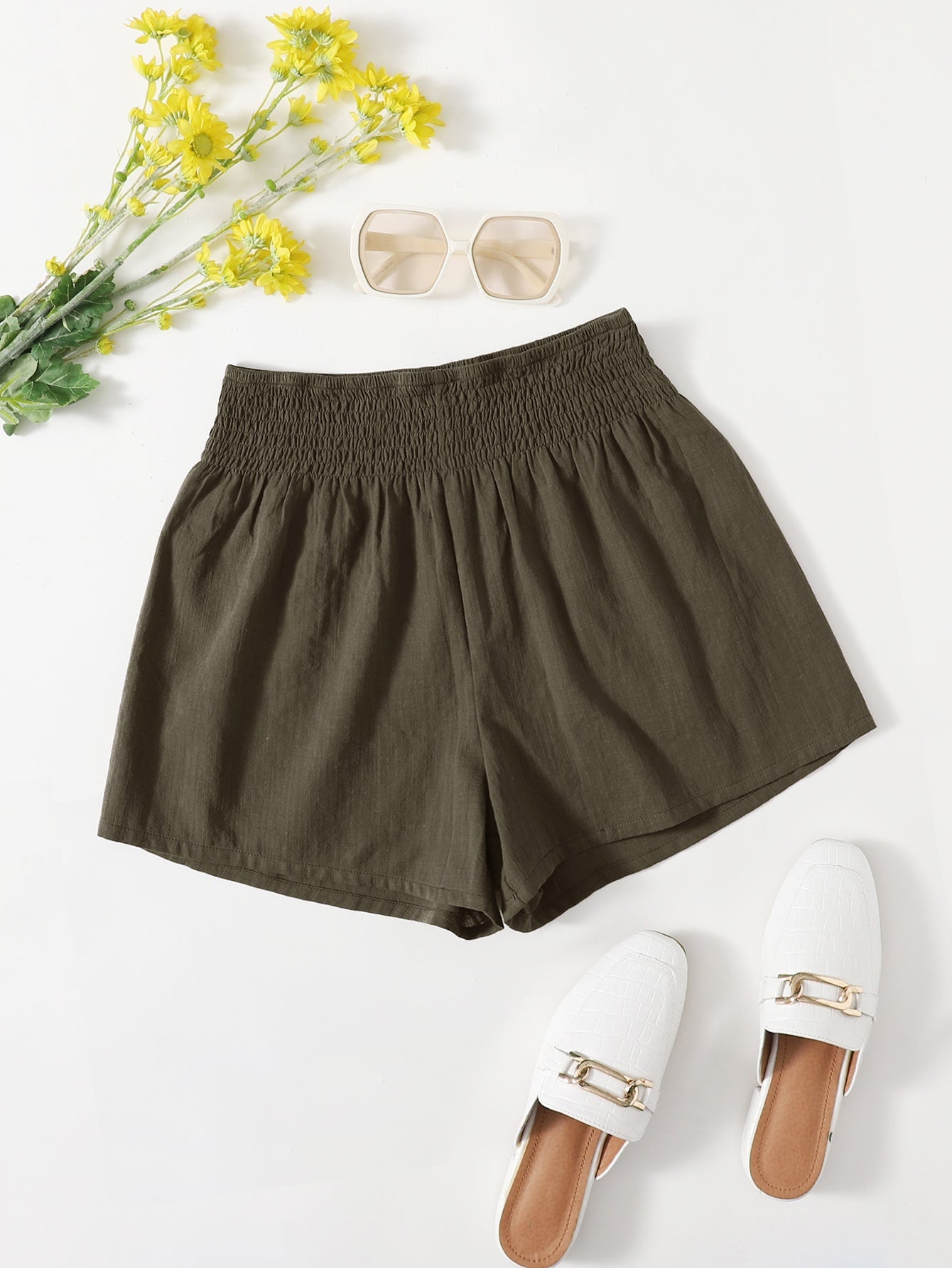 Boho Plain Shirred High Waist Women Shorts