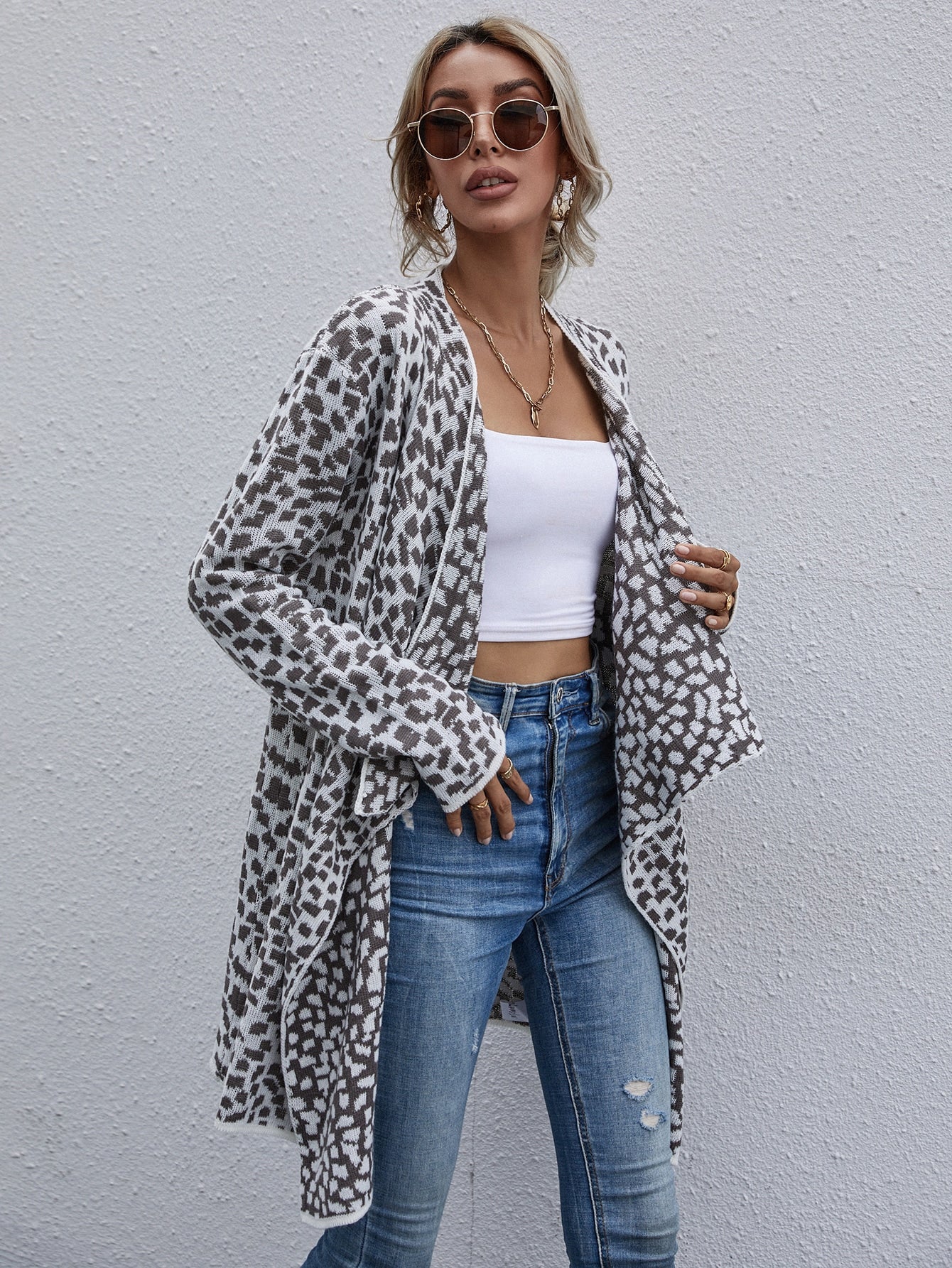 Casual All Over Print Long Sleeve Waterfall Short Women Cardigan