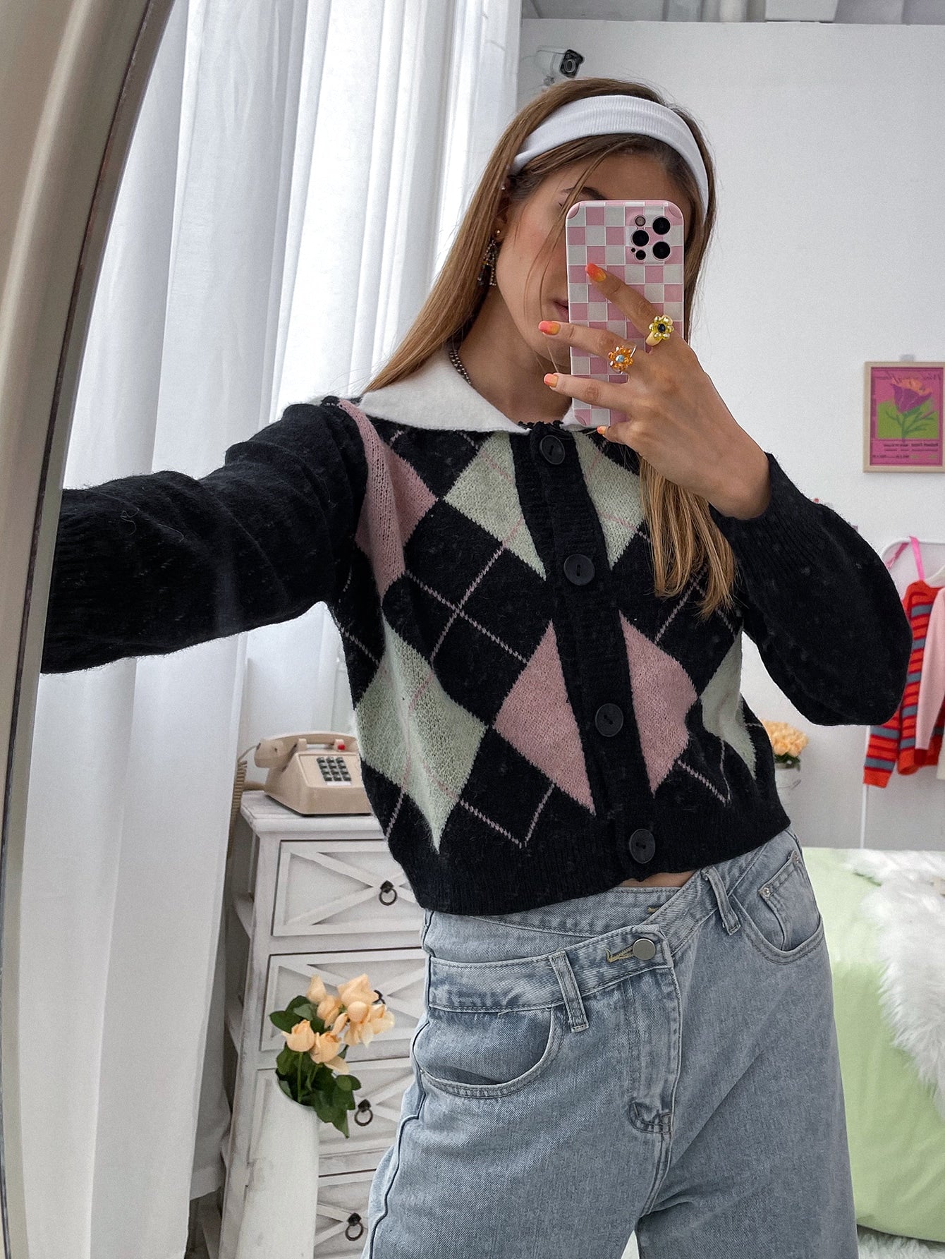 Casual Geometric Button Front Long Sleeve Collar Regular Women Cardigan