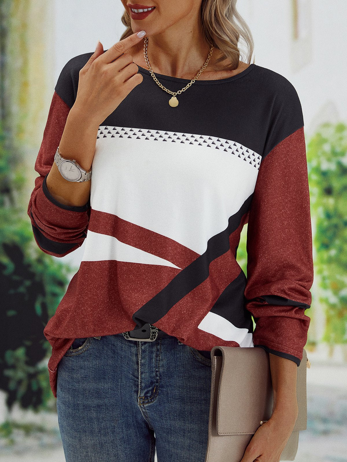 Casual Long Sleeve Crew Neck Color Block Loose Regular T-Shirt