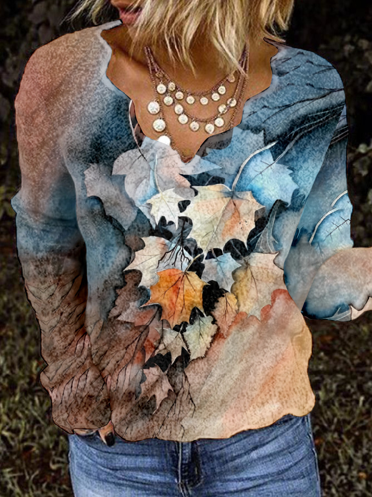 Casual Long Sleeve V Neck Floral Loose Regular Blouse