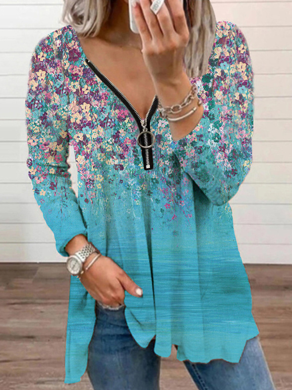 Casual Long Sleeve V Neck Floral Zipper Loose Mid-Long Blouse