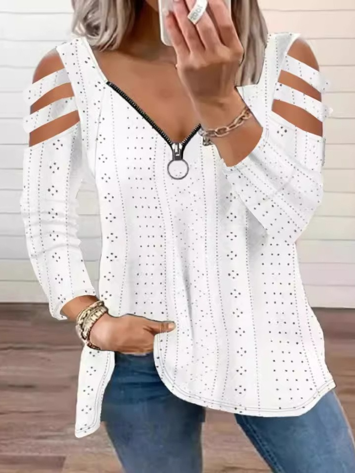Casual Long Sleeve V Neck Floral Zipper Loose Regular Blouse