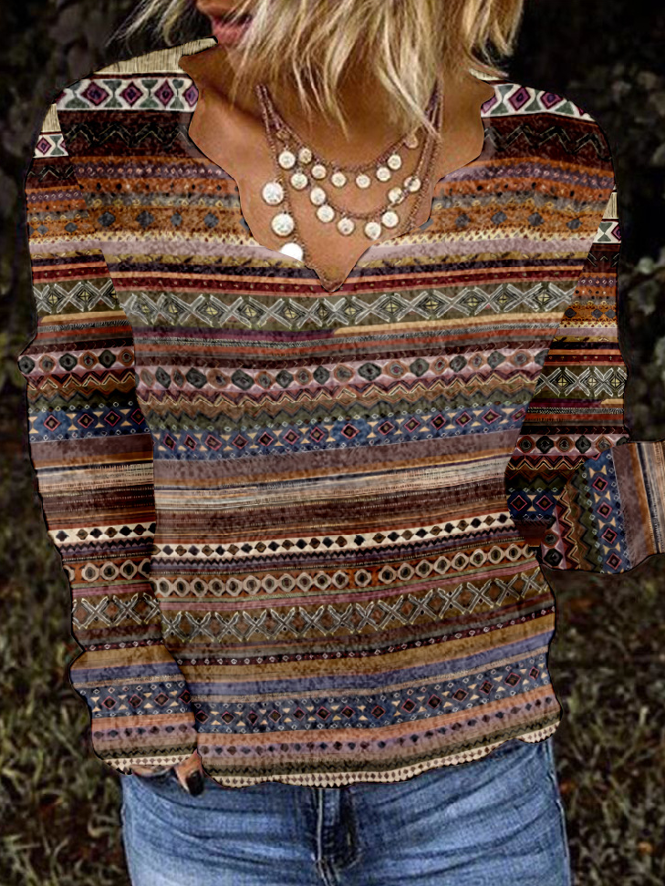 Casual Long Sleeve V Neck Geometric Loose Regular Blouse