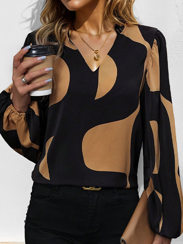 Casual Long Sleeve V Neck Geometric Loose Regular Blouse