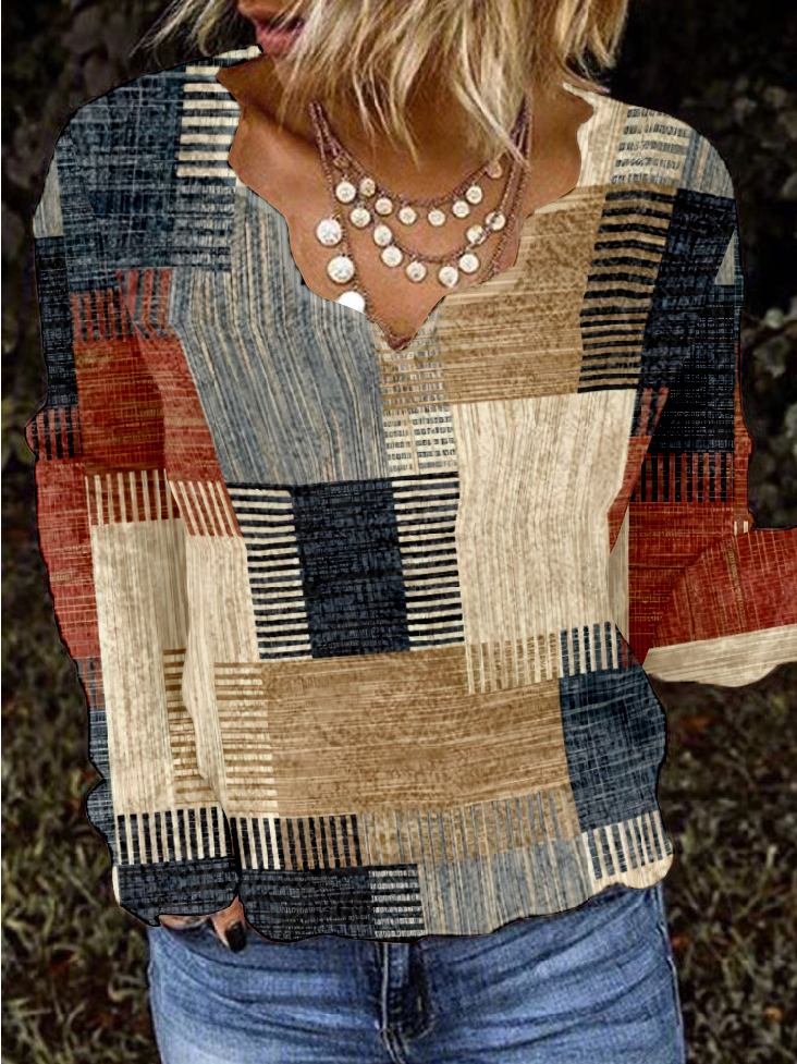 Casual Long Sleeve V Neck Geometric Loose Regular Blouse
