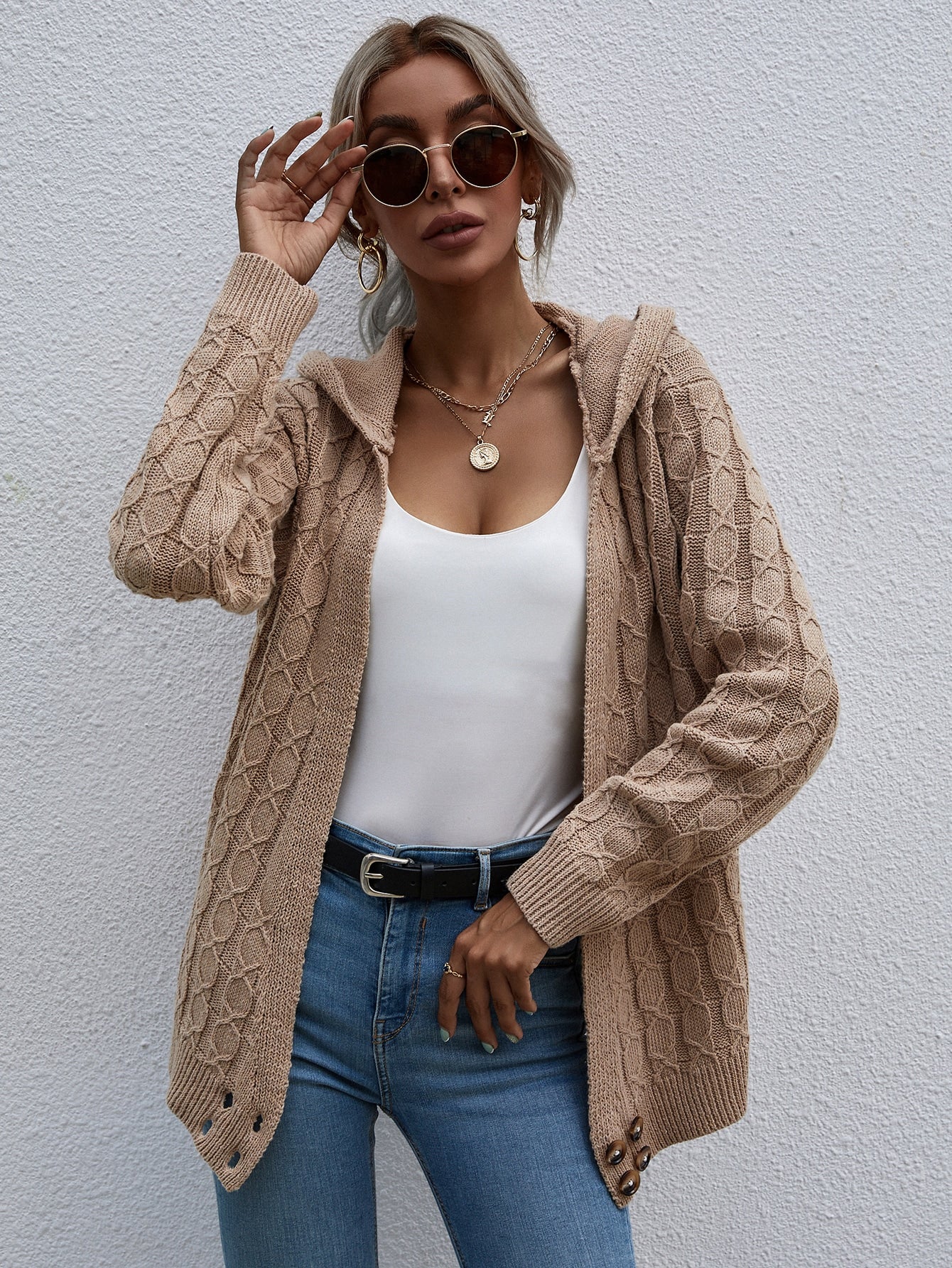 Casual Plain Button Long Sleeve Hooded Short Women Cardigan