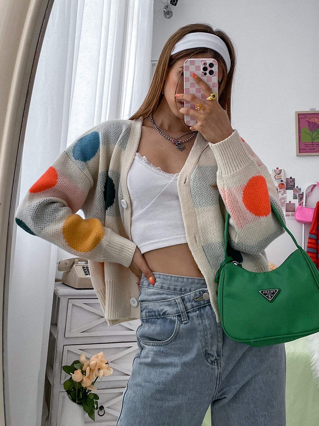 Casual Polka Dot Button Front Long Sleeve V Neck Regular Women Cardigan