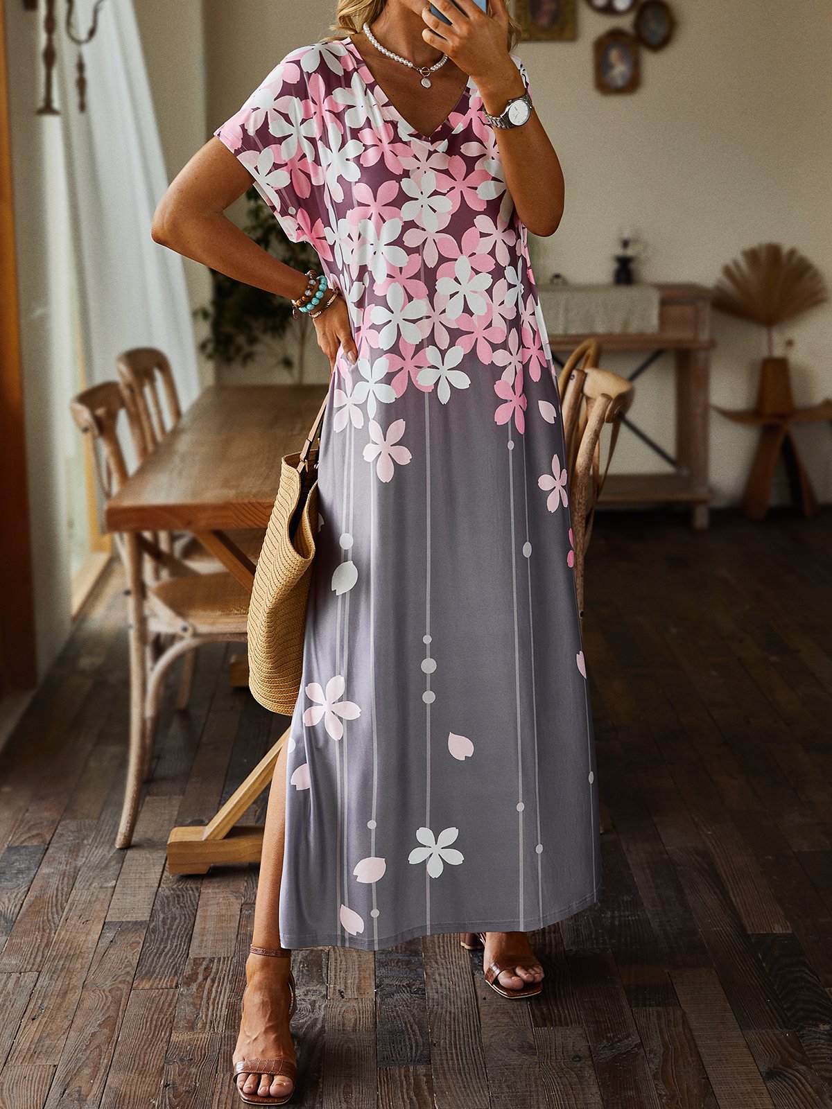Casual Short Sleeve V Neck Floral Maxi Dress