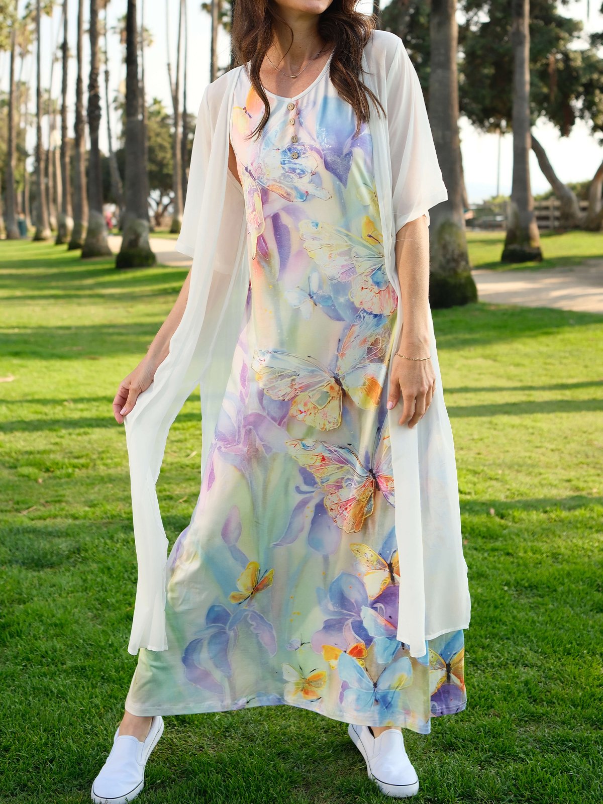 Casual Three Quarter Sleeve Crew Neck Floral Loose Maxi Dress
