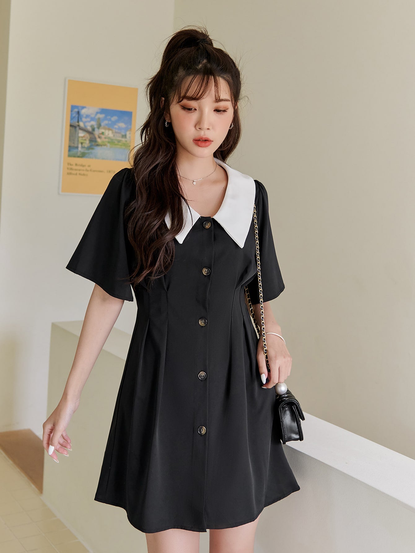 Colorblock Button Front Short Sleeve Peter Pan Collar Straight High Waist Short Dress