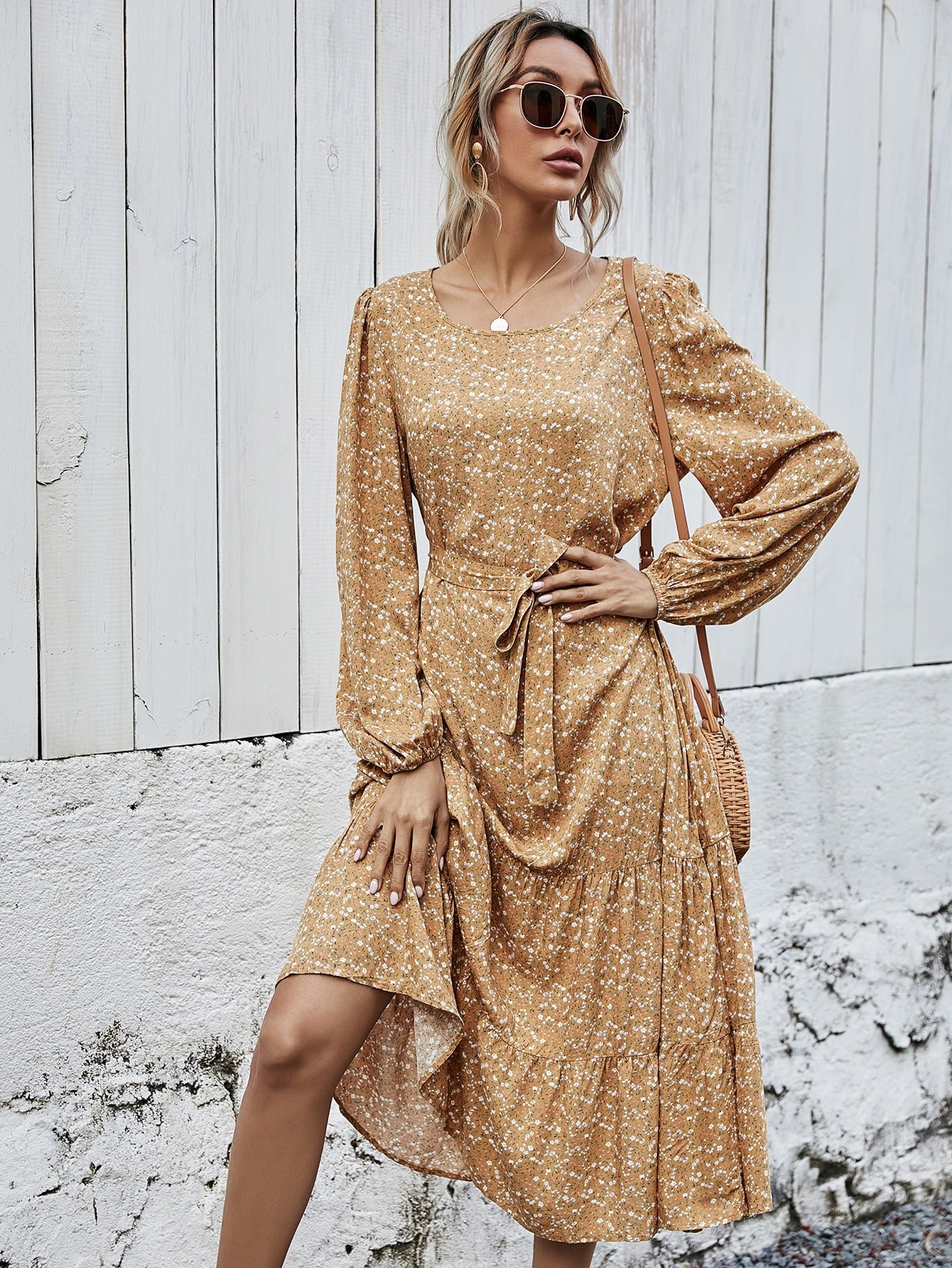 Ditsy Floral Belted Long Sleeve Round Neck Flounce High Waist Long Dress