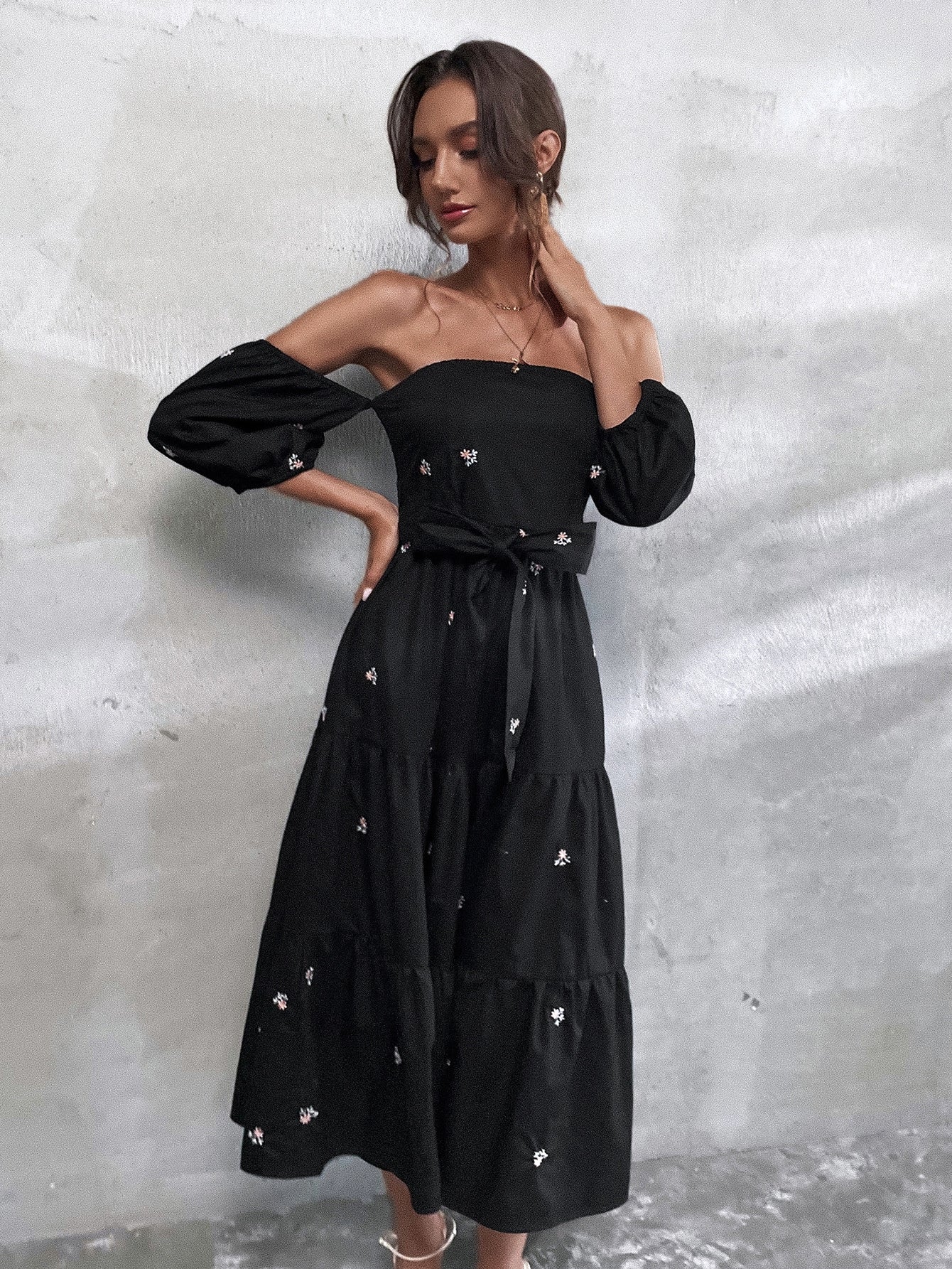 Ditsy Floral Belted Three Quarter Length Sleeve Off The Shoulder Flared High Waist Long Dress