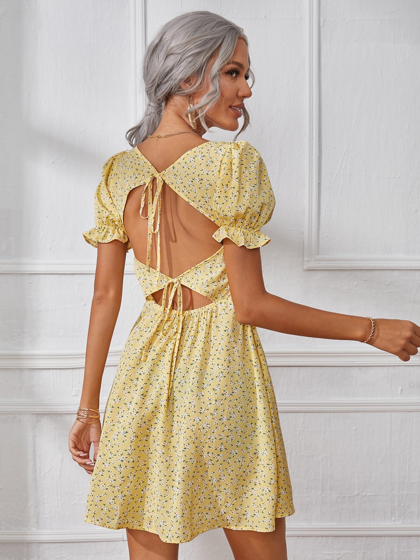 Ditsy Floral Ruched Bust Short Sleeve Square Neck Flared High Waist Short Dress
