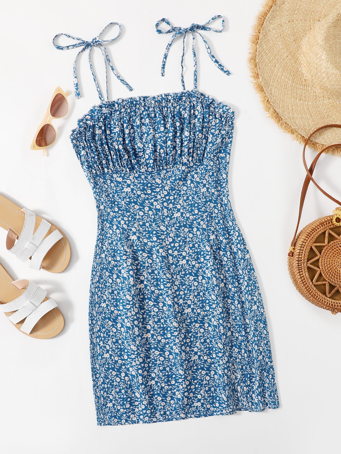 Ditsy Floral Ruched Bust Sleeveless Spaghetti Strap Pencil High Waist Short Dress