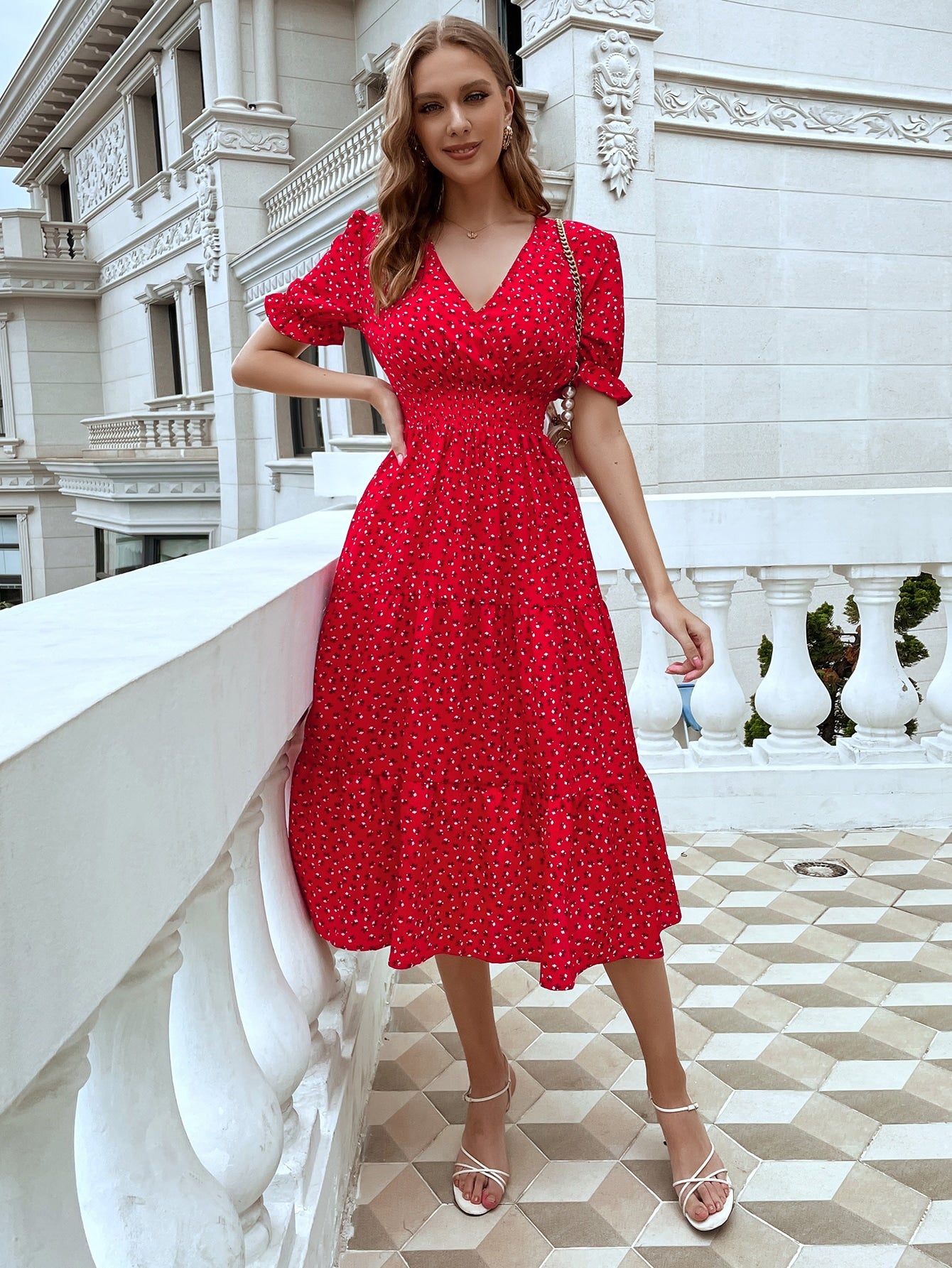 Ditsy Floral Ruffle Hem Short Sleeve V Neck Flared High Waist Long Dress