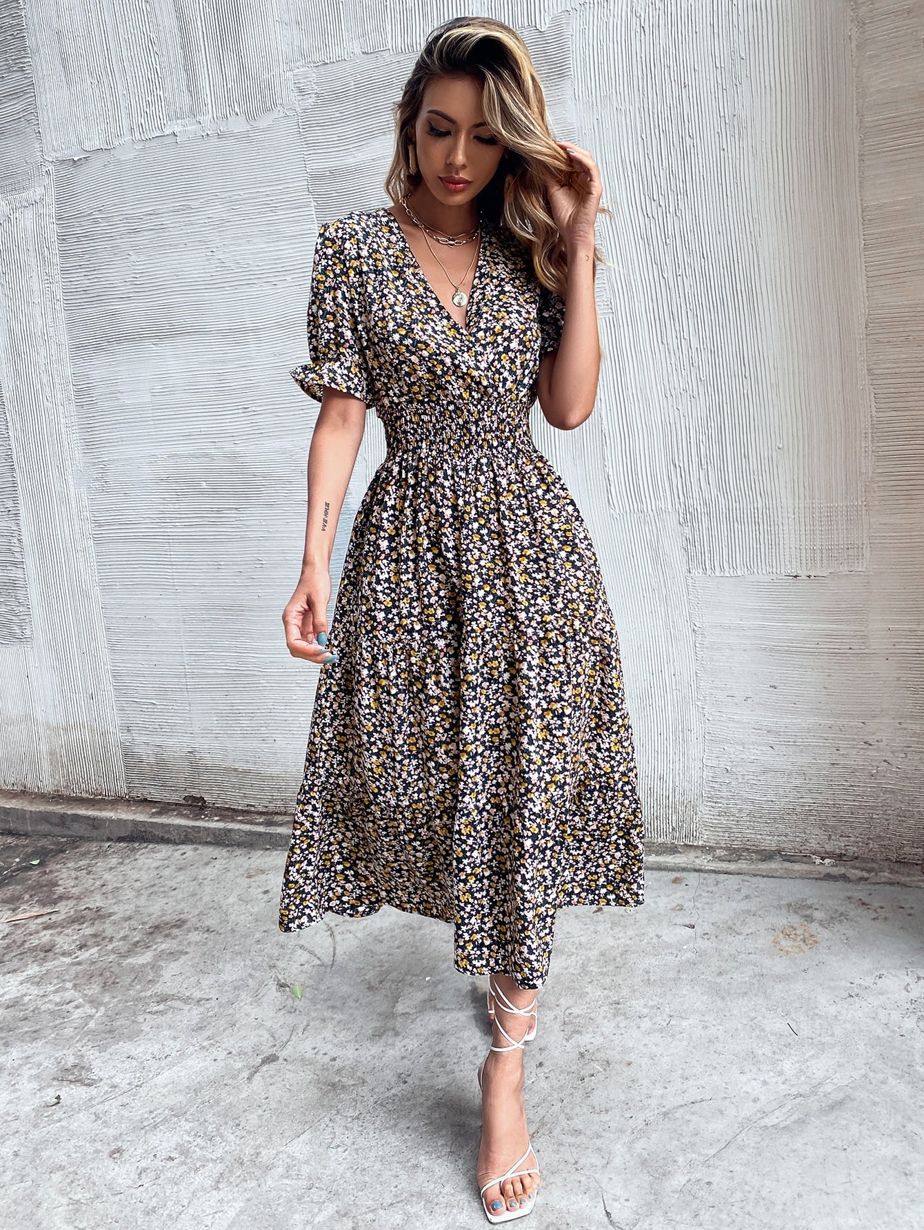 Ditsy Floral Shirred Short Sleeve V Neck Flared High Waist Long Dress
