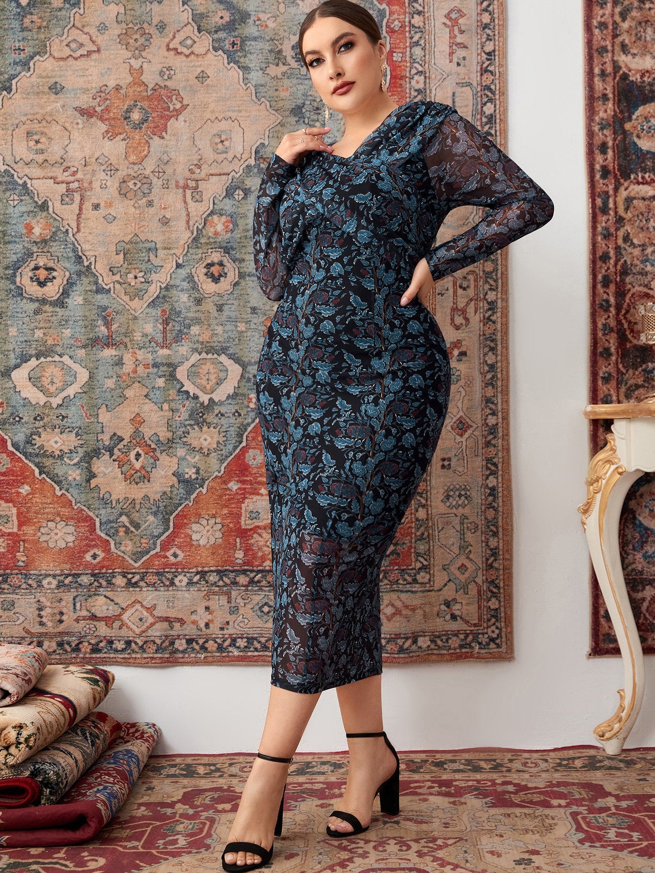 Elegant All Over Print Zipper Long Sleeve Cowl Neck Pencil Natural Long Plus Size Dress