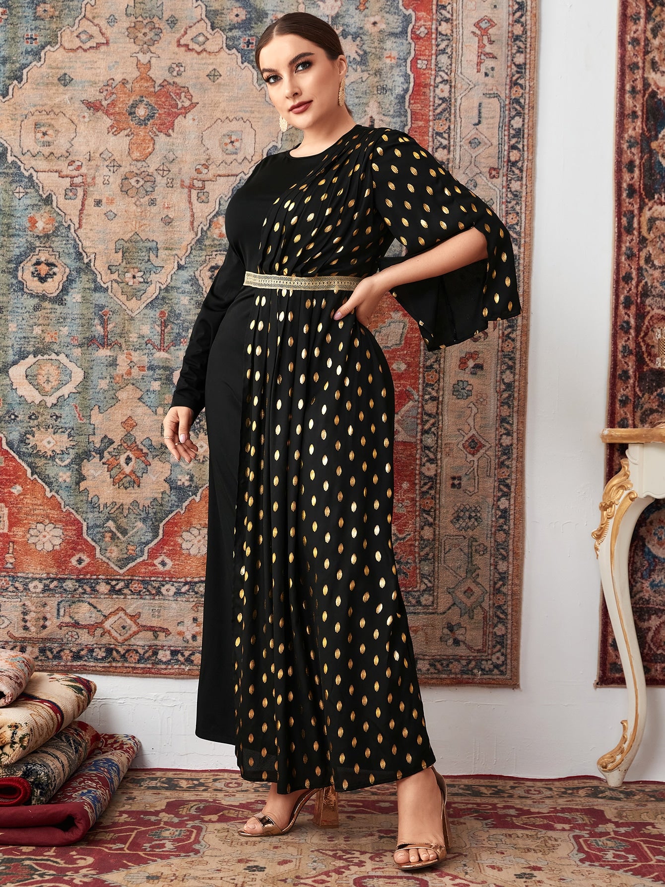 Elegant All Over Print Zipper Three Quarter Length Sleeve Round Neck Flared High Waist Maxi Plus Size Dress