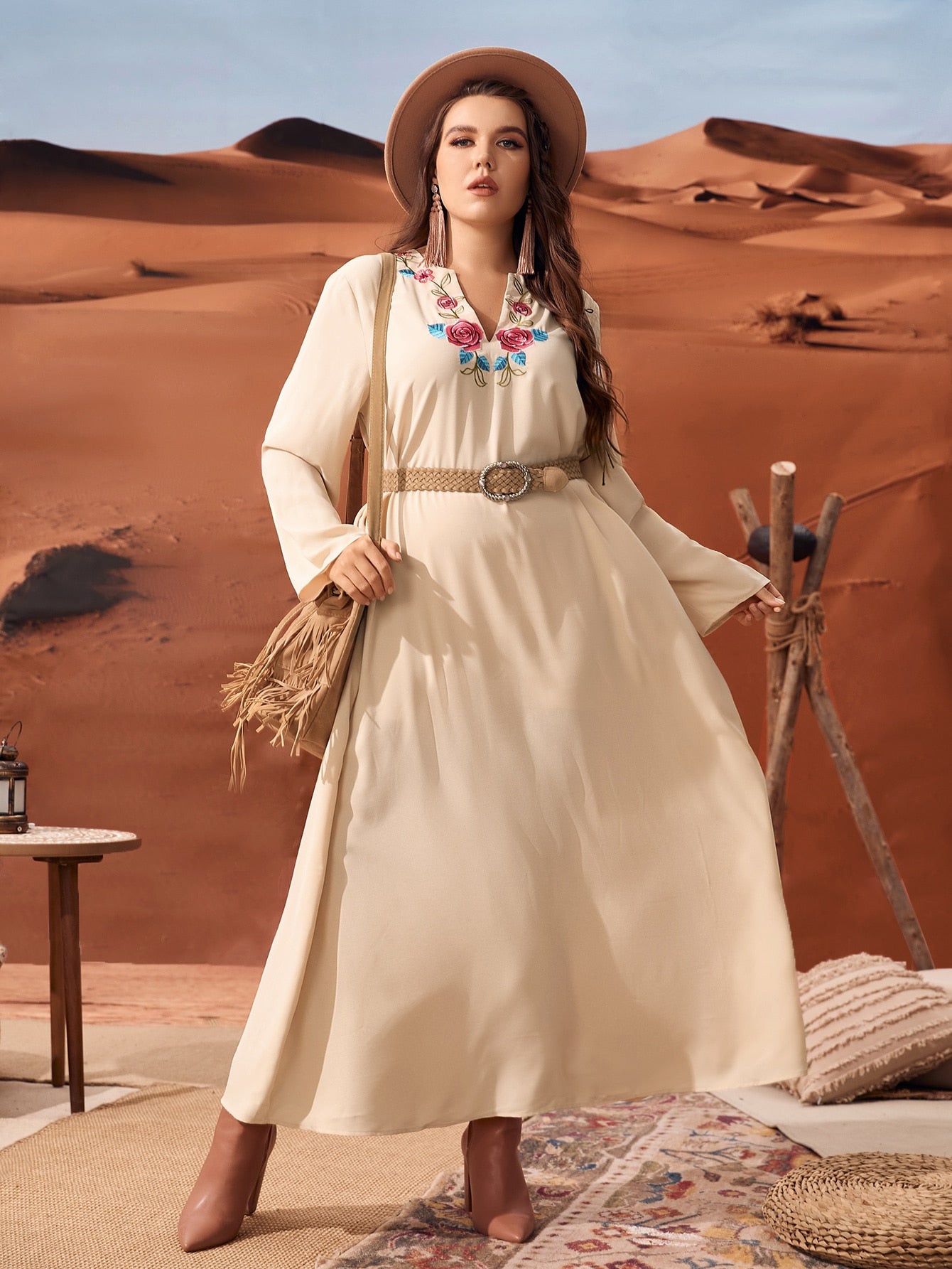 Elegant Floral Embroidery Long Sleeve Notched Flared High Waist Maxi Plus Size Dress