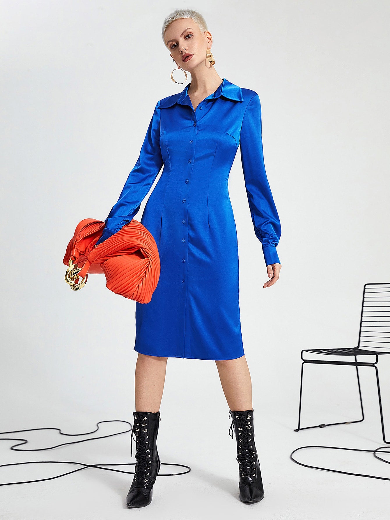 Elegant Plain Button Long Sleeve Collar Straight Natural Knee Length Dress
