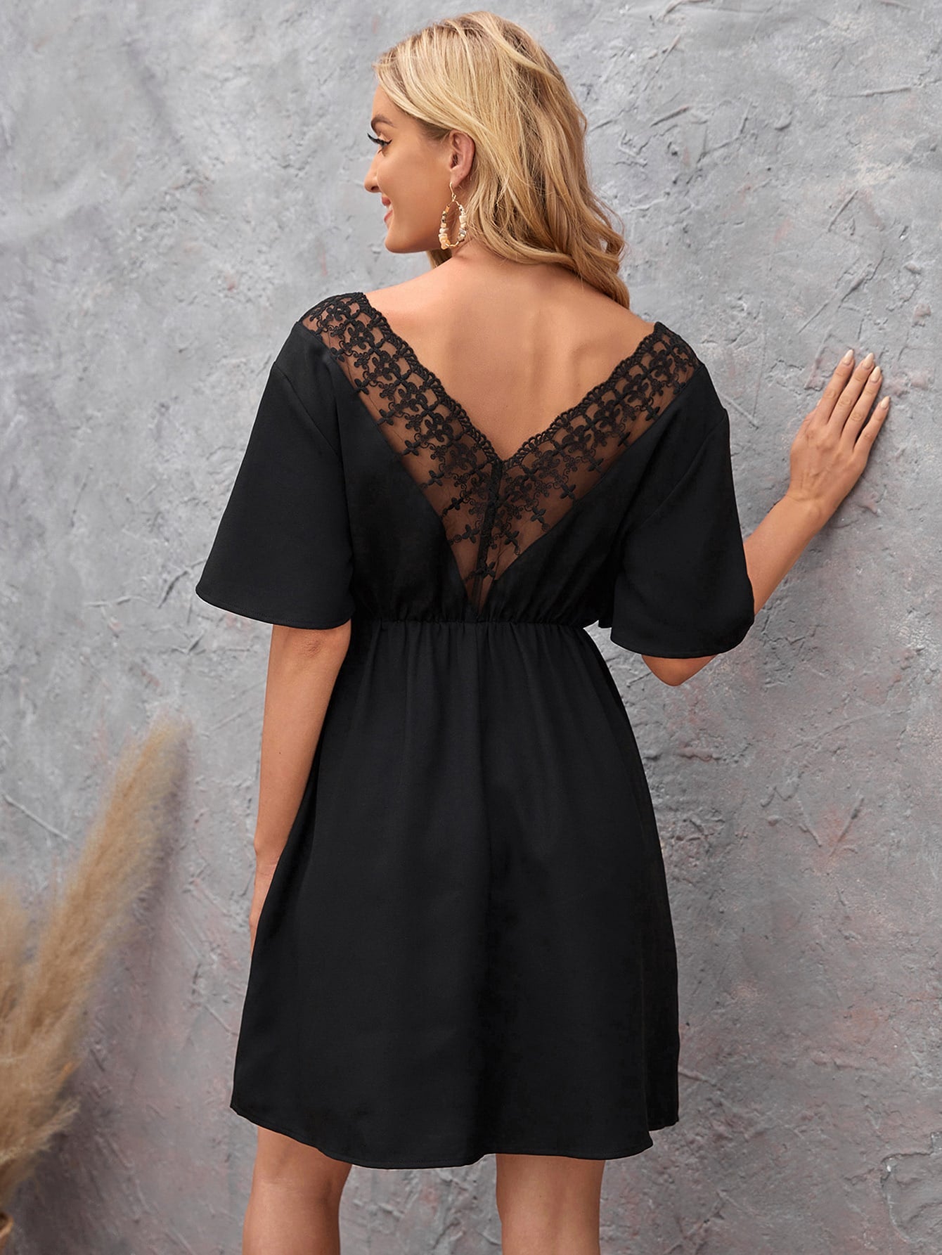 Elegant Plain Contrast Mesh Short Sleeve V Neck Flared High Waist Short Dress