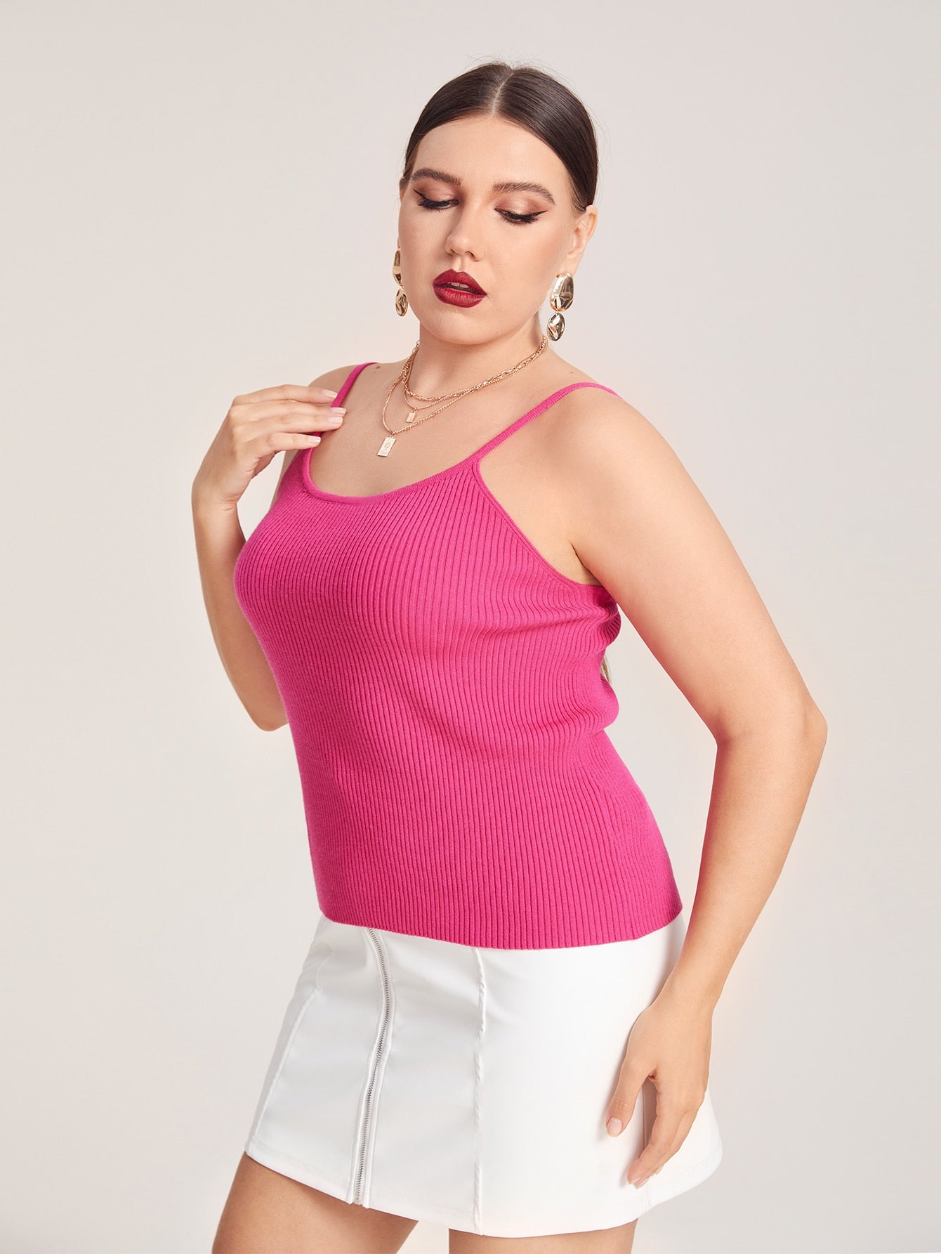 Elegant Plain Rib-Knit Sleeveless Spaghetti Strap Regular Plus Size Knit Top
