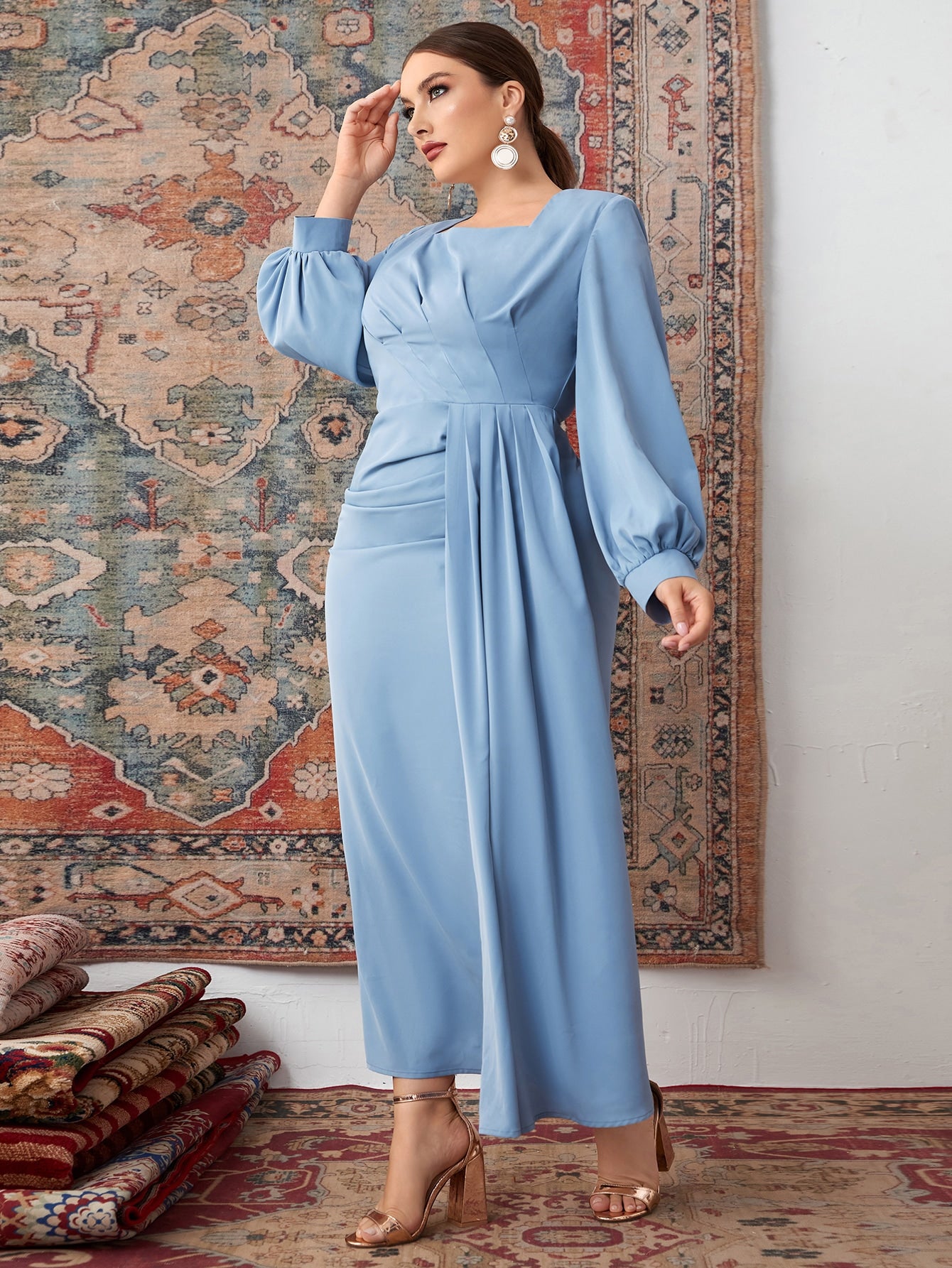 Elegant Plain Split Long Sleeve Square Neck Slit High Waist Long Plus Size Dress