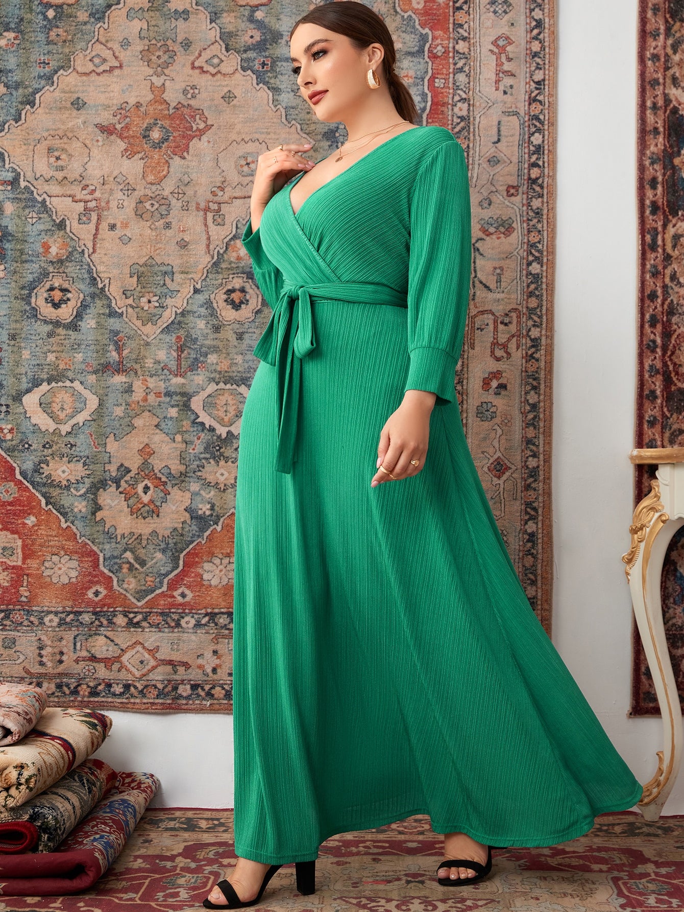 Elegant Plain Wrap Long Sleeve V Neck Flared High Waist Maxi Plus Size Dress