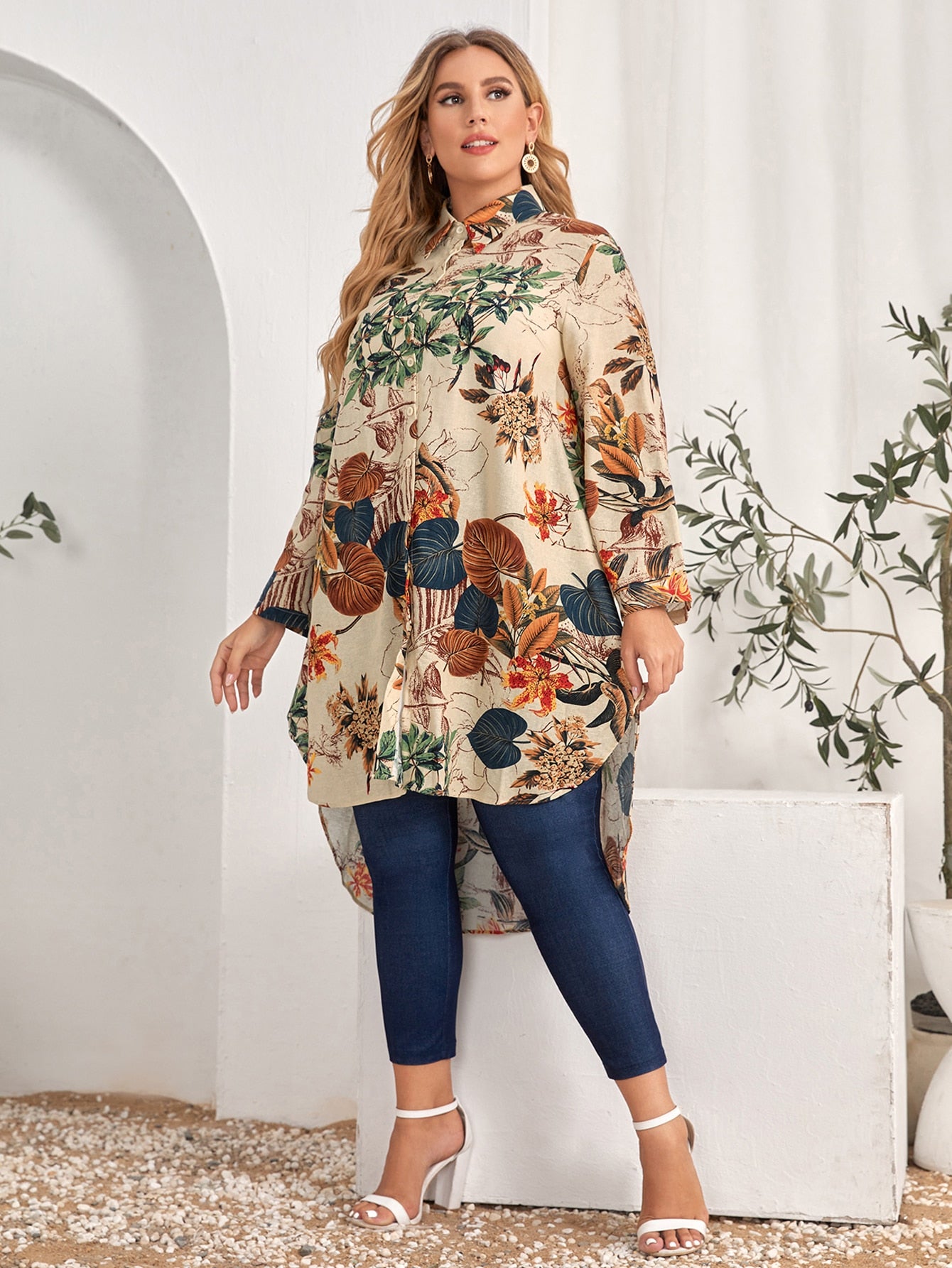 Floral Button Front Long Sleeve Collar Asymmetrical Long Plus Size Blouse