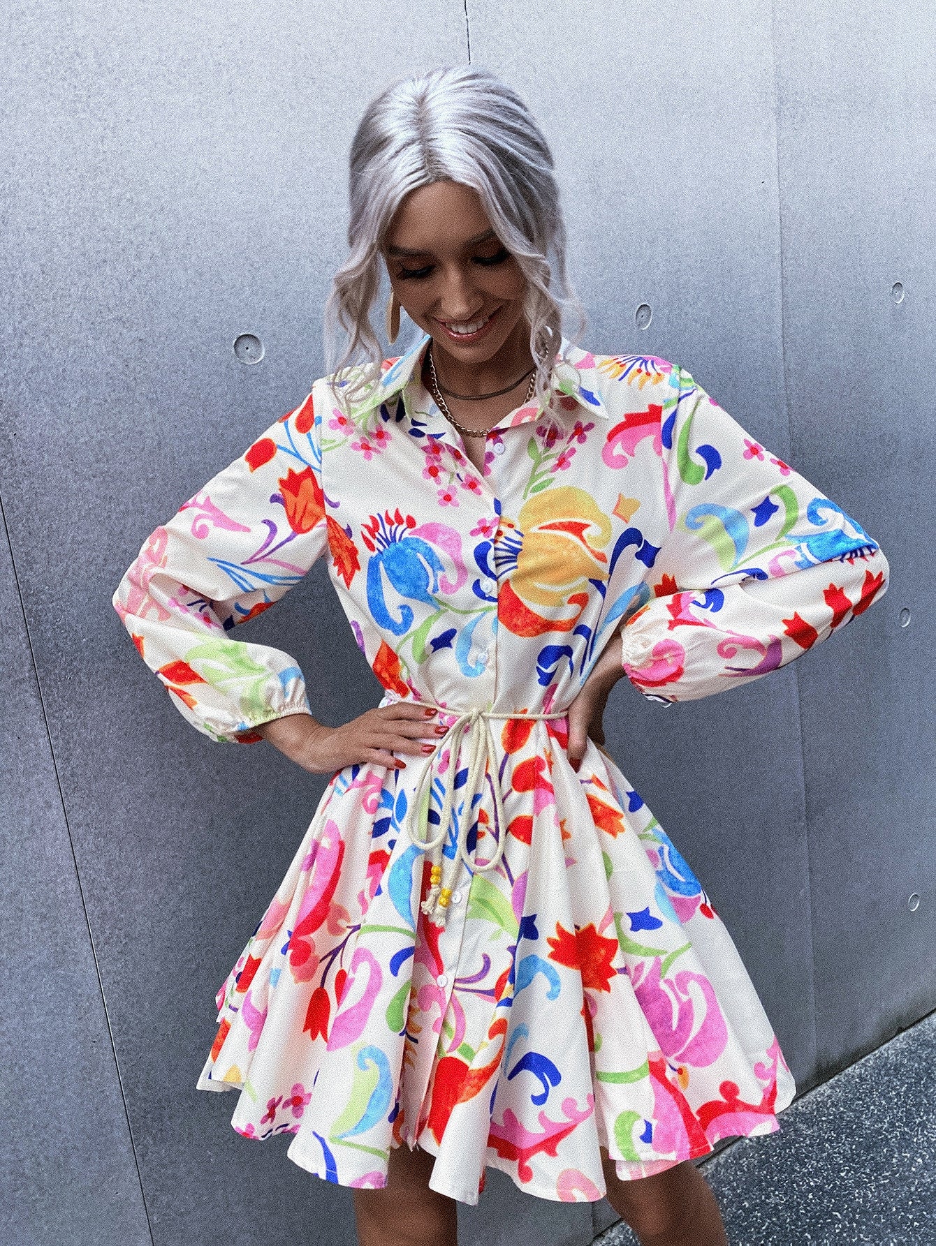 Floral Button Front Long Sleeve Collar Flared High Waist Short Dress