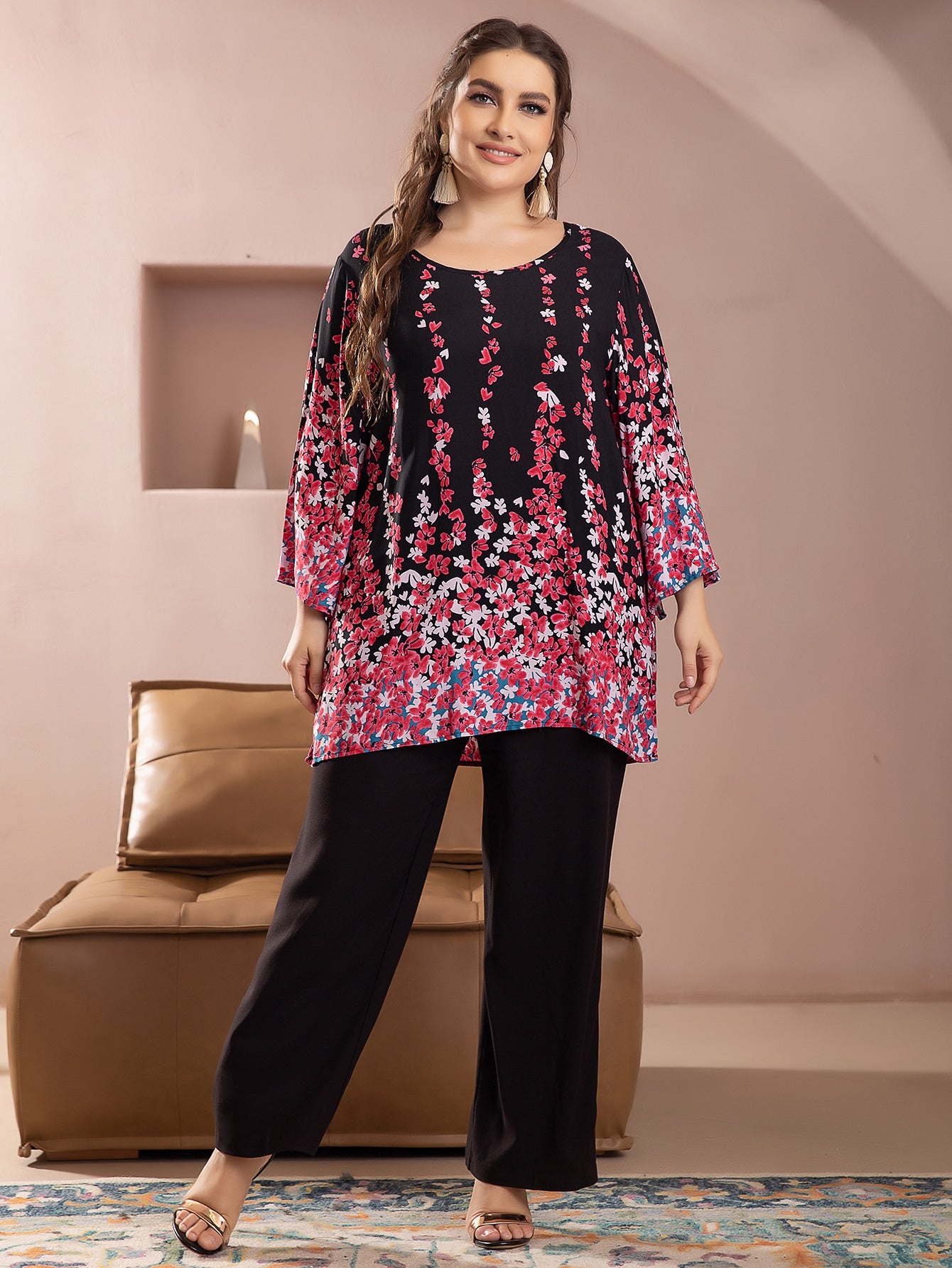 Floral Long Sleeve Scoop Neck Long Plus Size Blouse