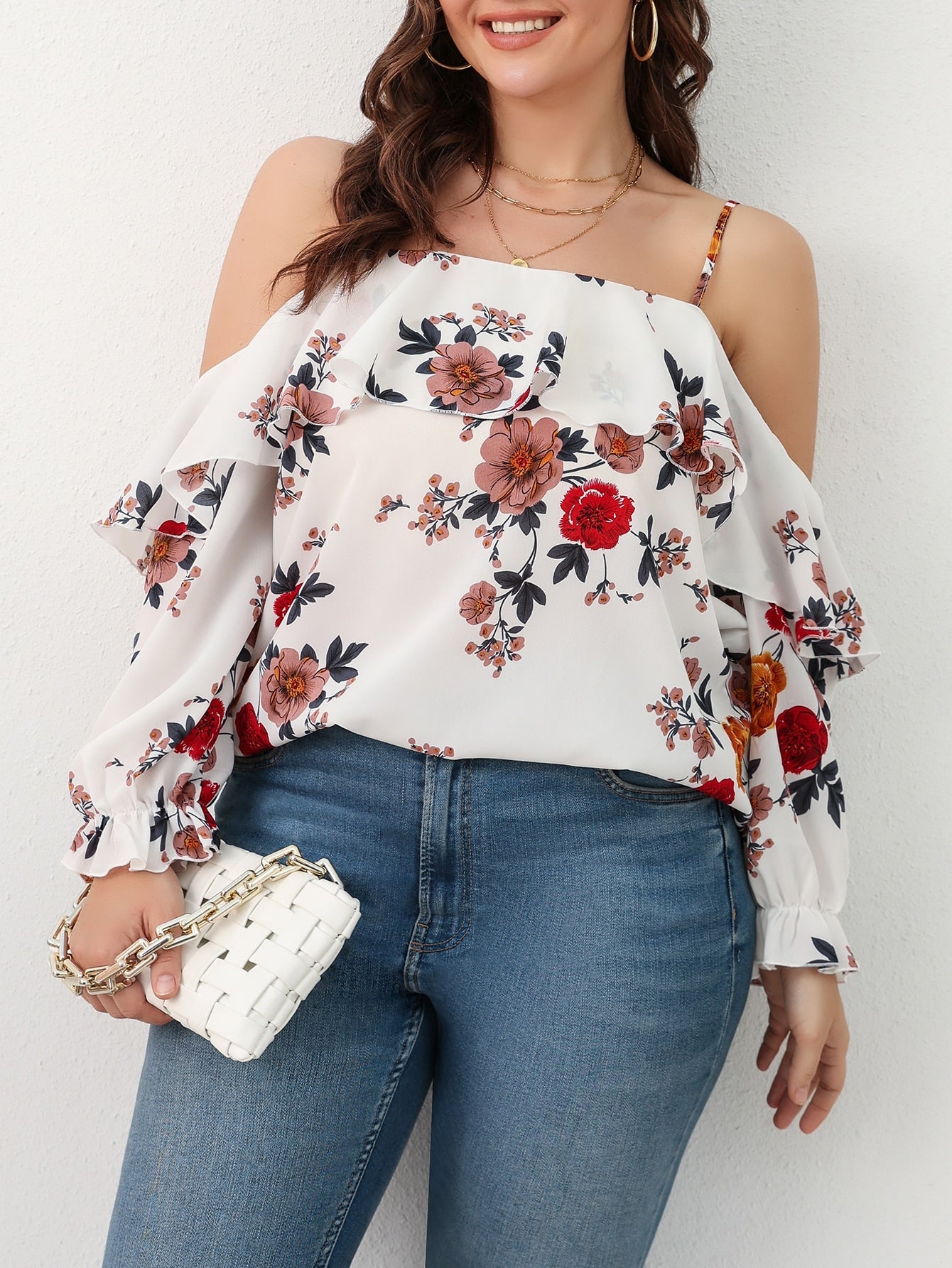 Floral Ruffle Long Sleeve Cold Shoulder Semi-Sheer Long Plus Size Blouse