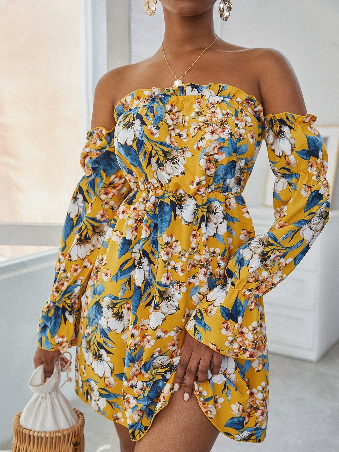 Floral Ruffle Long Sleeve Off The Shoulder Flared High Waist Women Short Dress