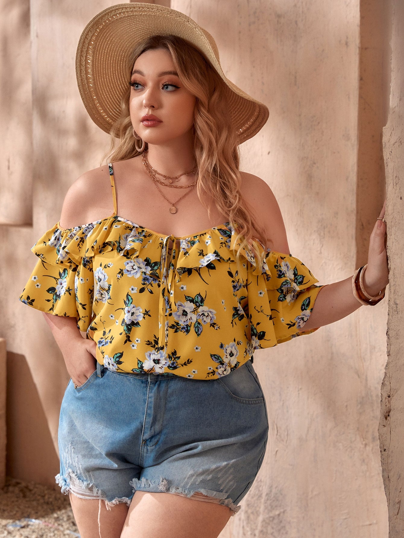 Floral Ruffle Short Sleeve Cold Shoulder Regular Plus Size Blouse