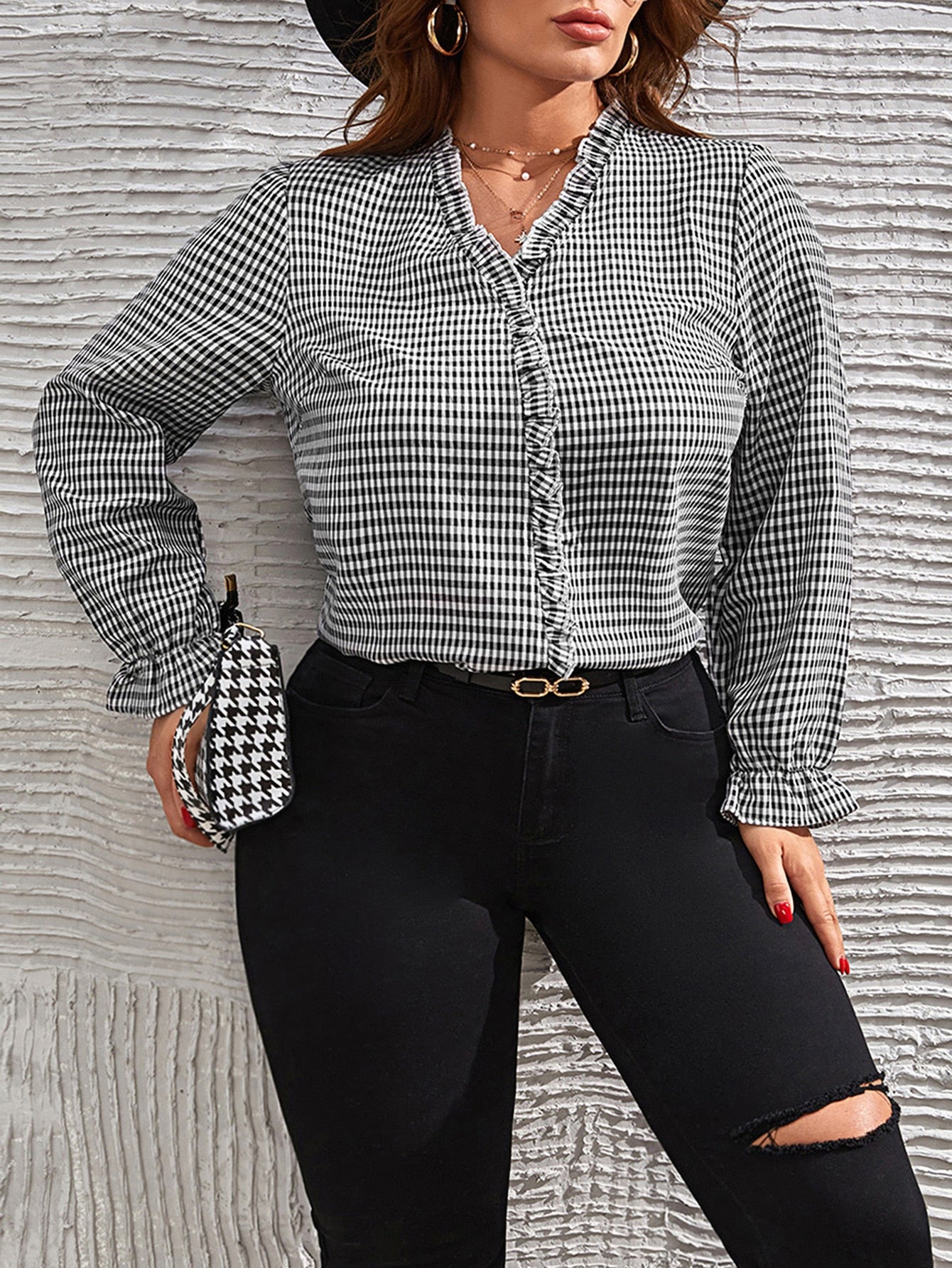 Gingham Frill Long Sleeve V Neck Regular Plus Size Blouse