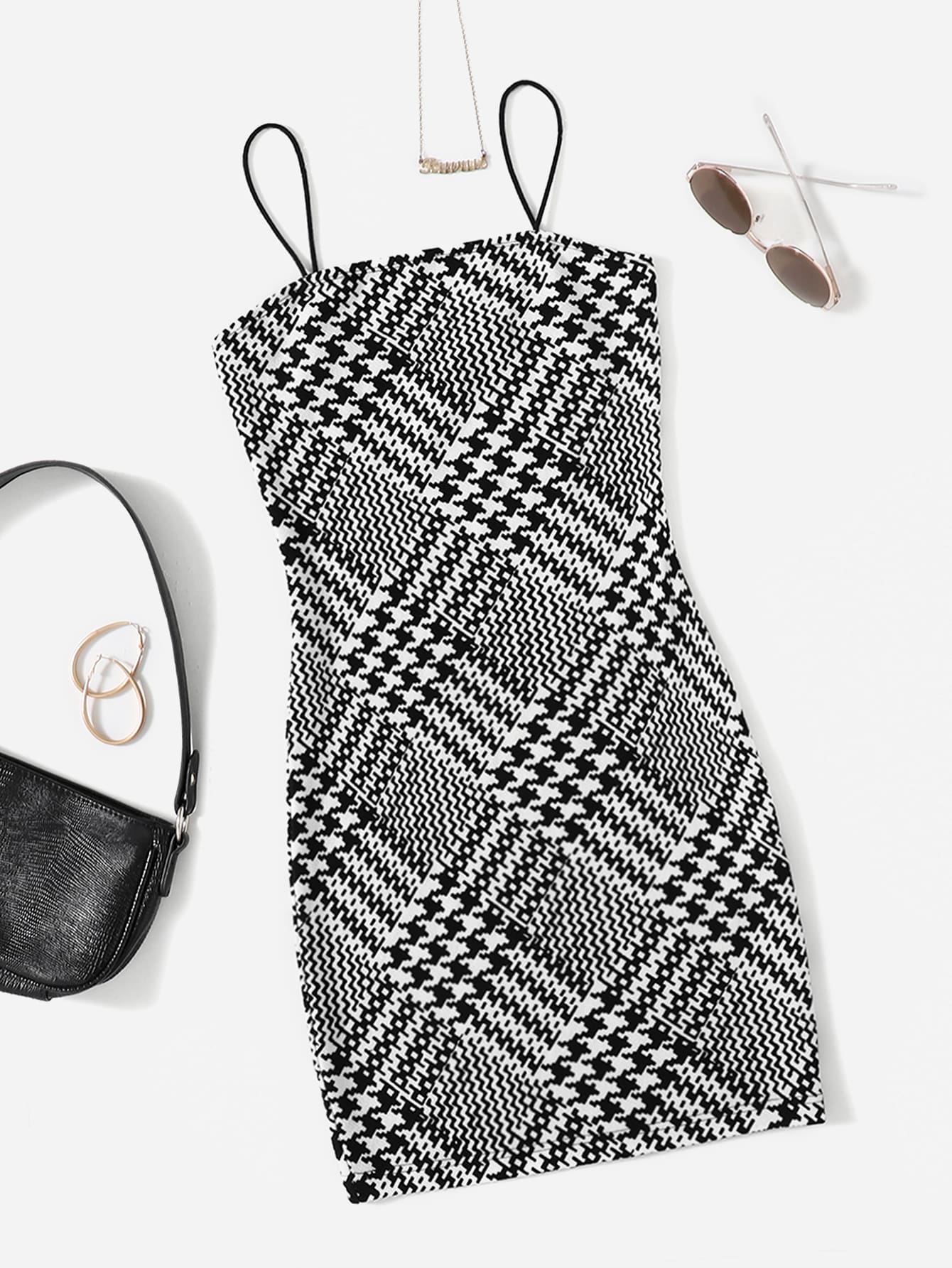 Houndstooth Sleeveless Spaghetti Strap Pencil Natural Mini Dress