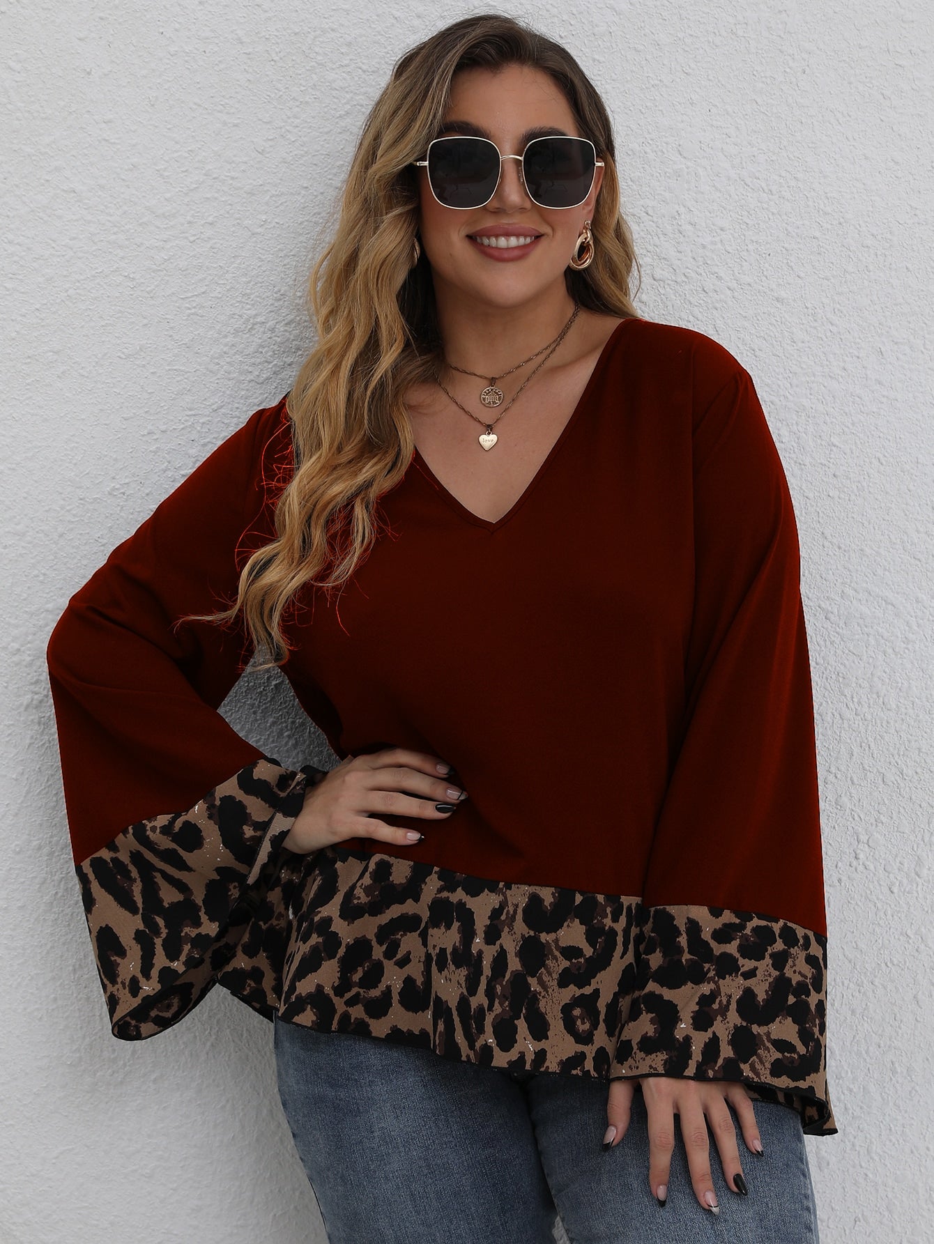 Leopard Ruffle Hem Long Sleeve V Neck Regular Plus Size Blouse