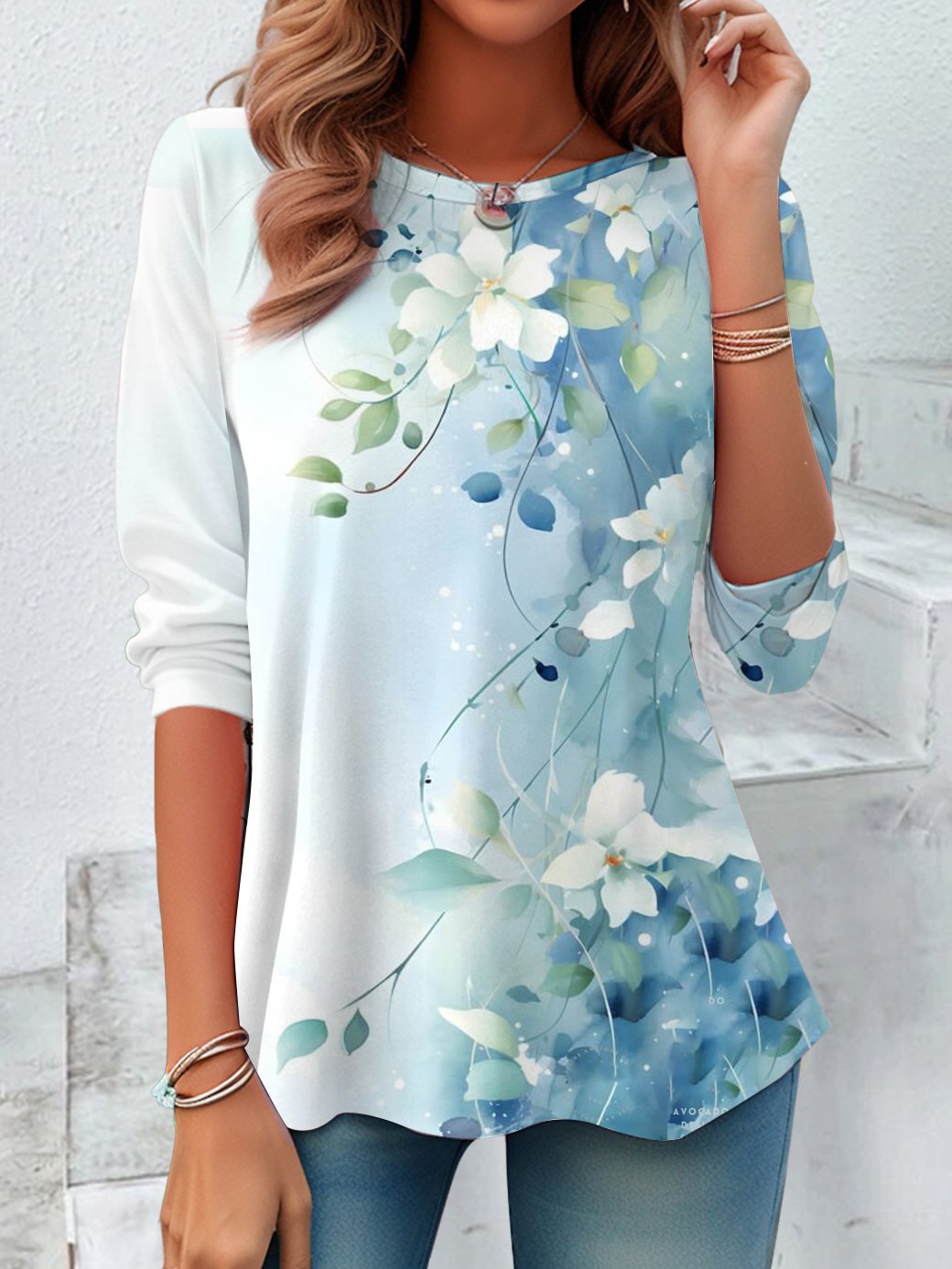 Loose Long Sleeve Crew Neck Floral Vintage Regular Blouse