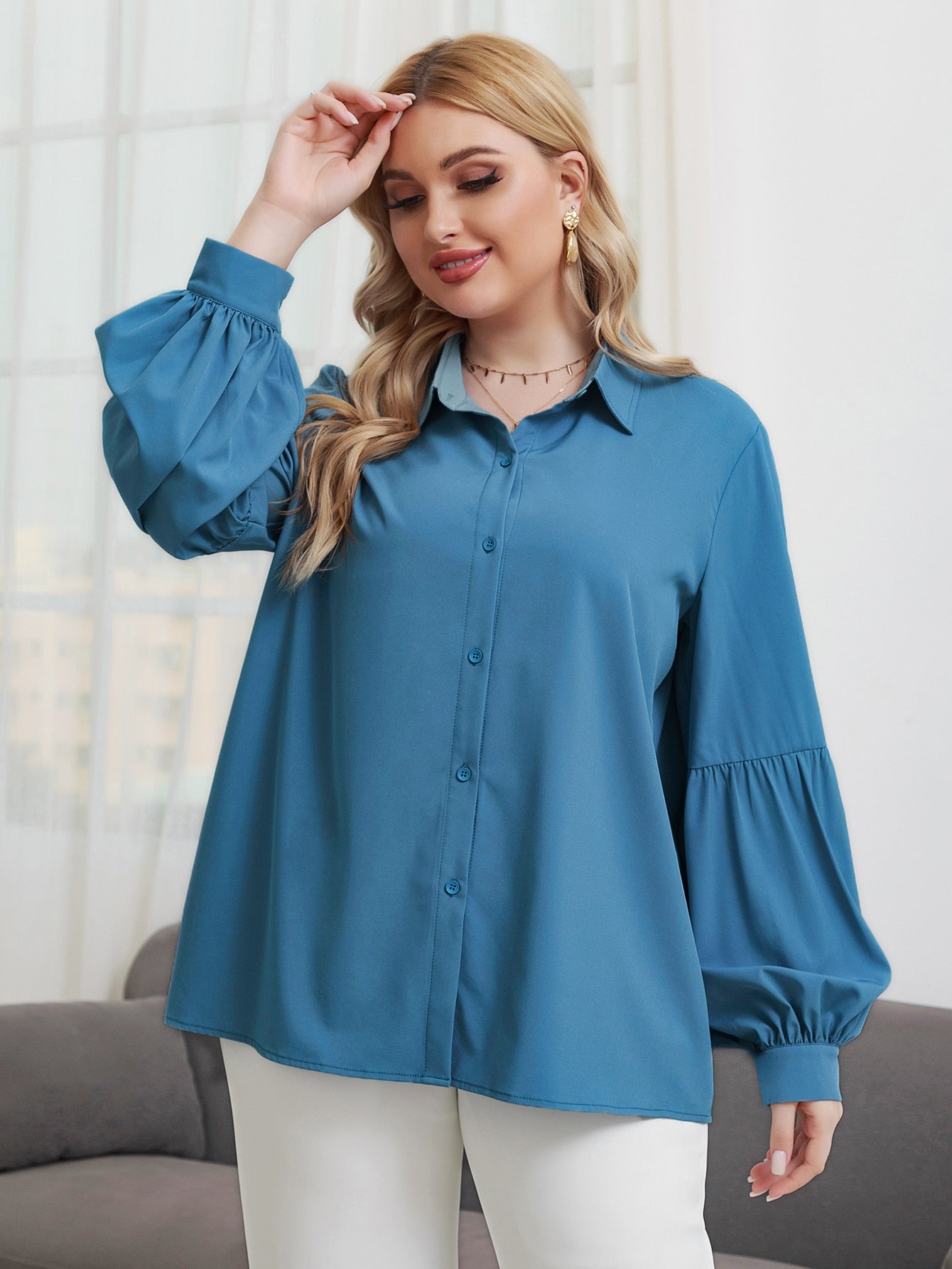 Plain Button Front Long Sleeve Collar Long Plus Size Blouse