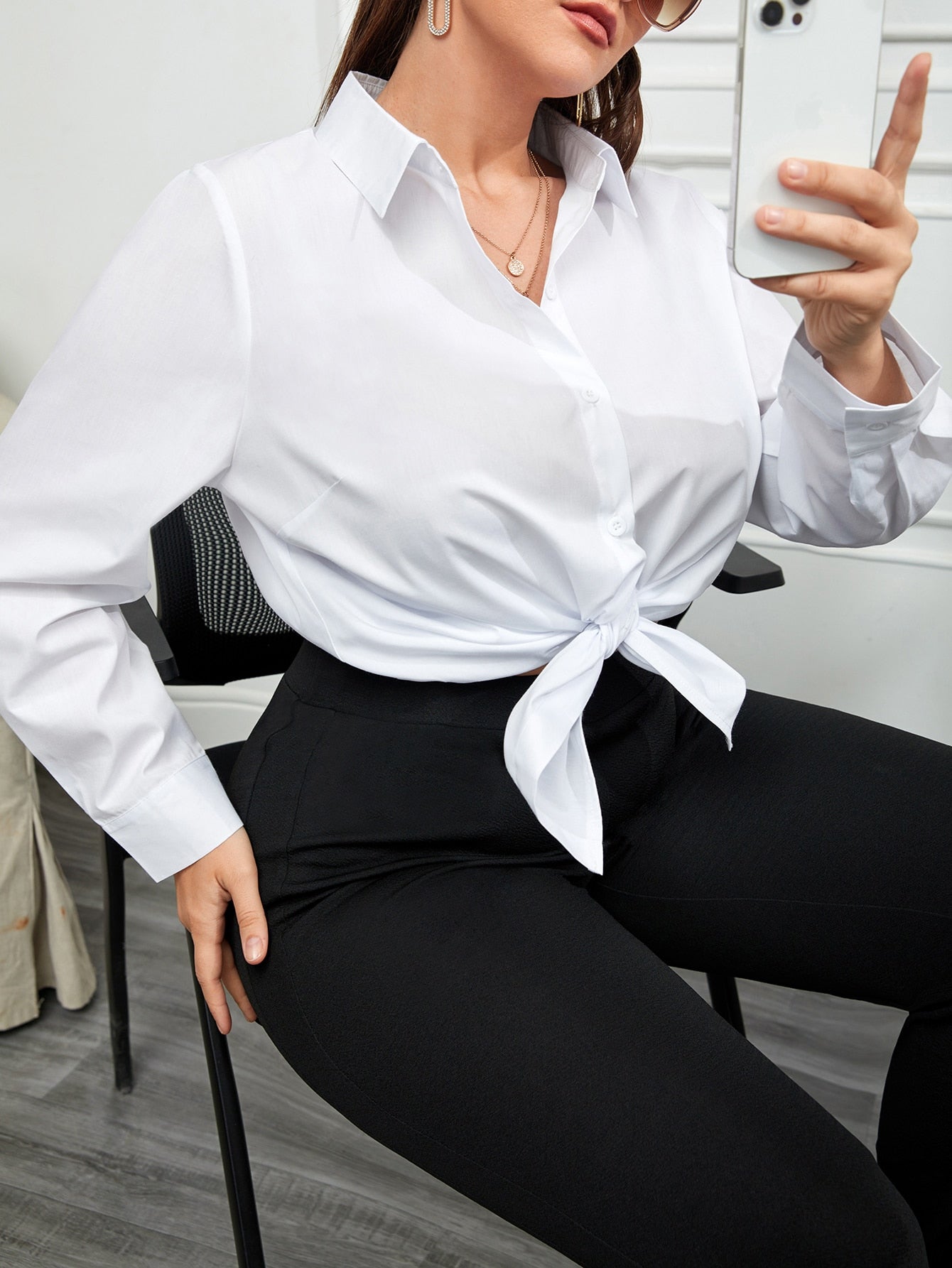 Plain Button Front Long Sleeve Collar Semi-Sheer Long Plus Size Blouse