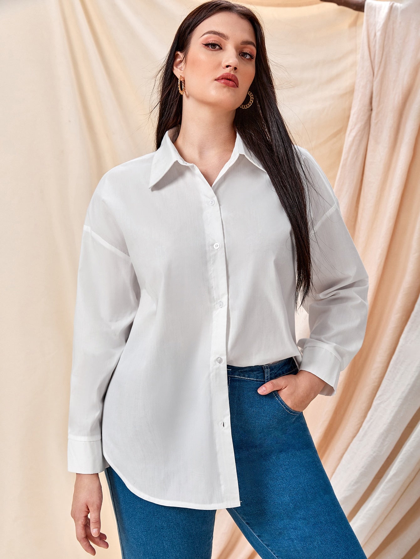 Plain Button Front Long Sleeve Collar Semi-Sheer Long Plus Size Blouse