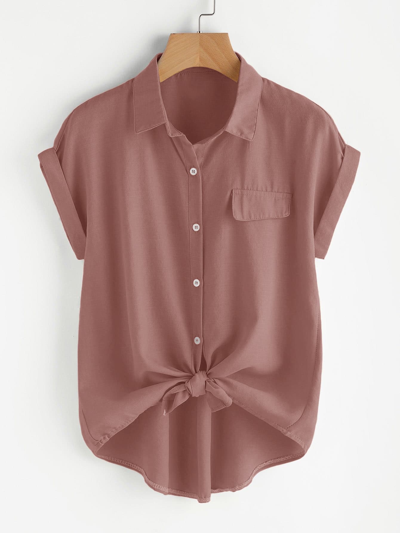 Plain Button Front Short Sleeve Collar Asymmetrical Regular Plus Size Blouse