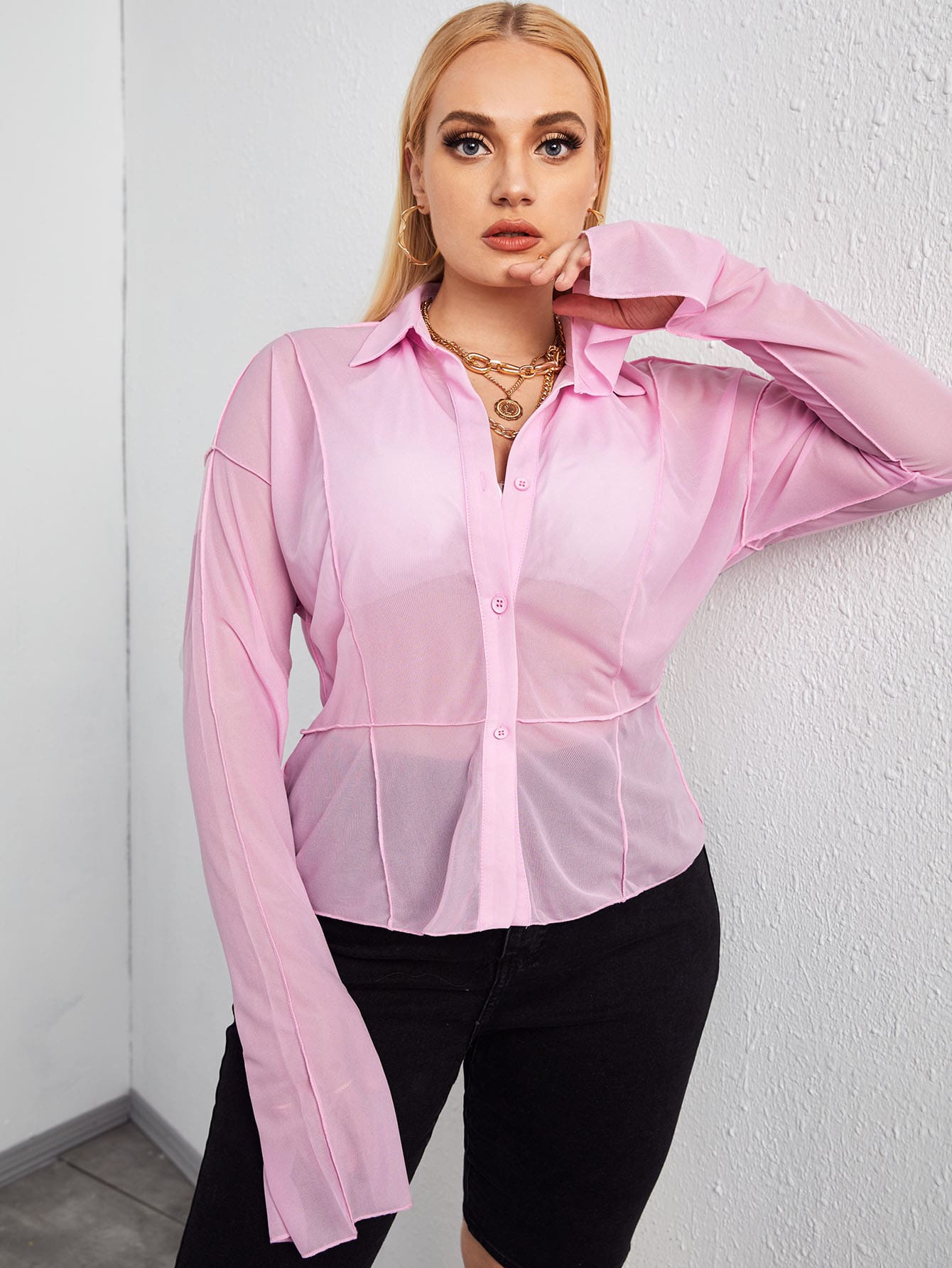 Plain Button Long Sleeve Collar Semi-Sheer Regular Plus Size Blouse