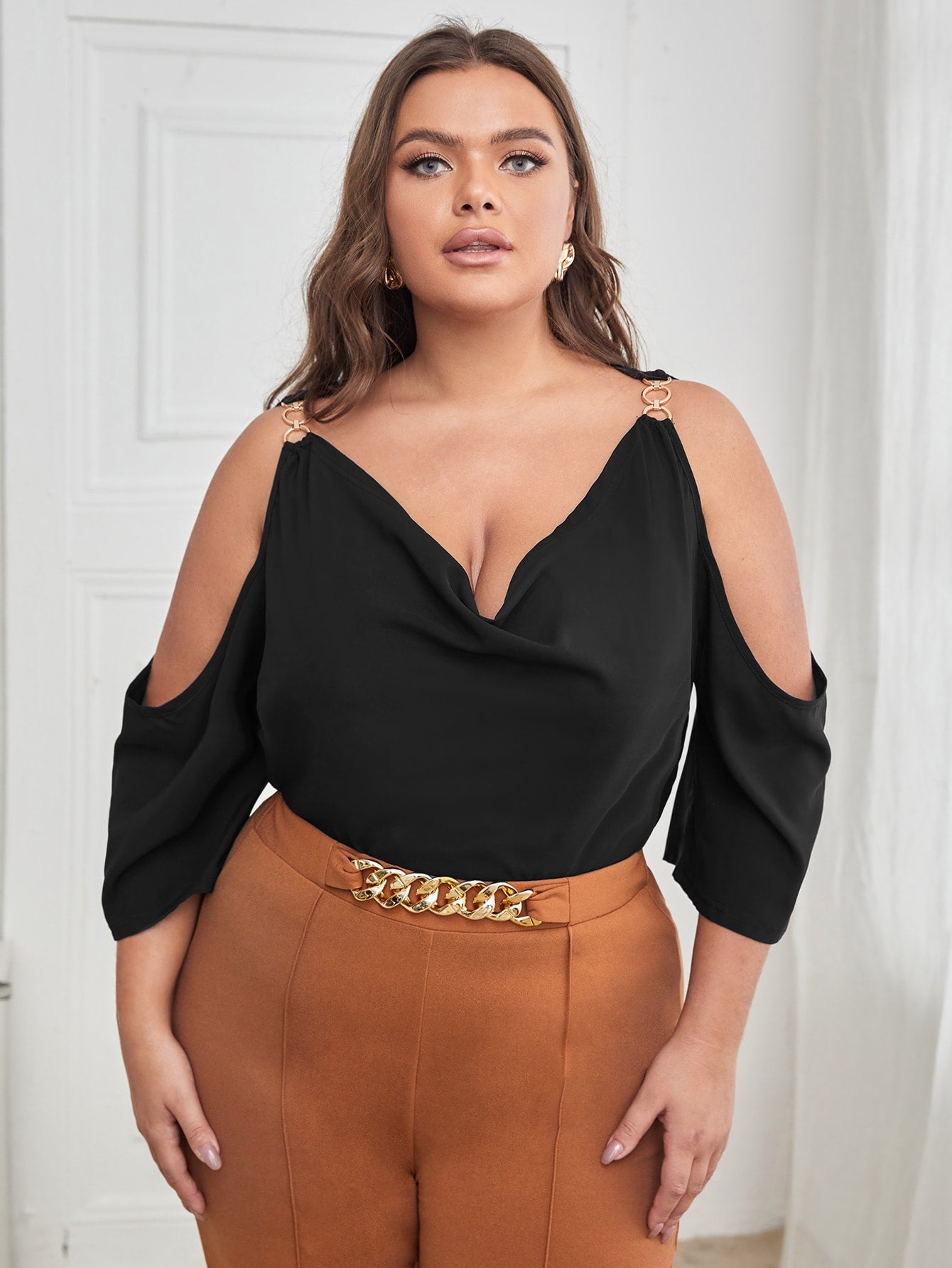 Plain Cut Out Three Quarter Length Sleeve Cold Shoulder Regular Plus Size Blouse