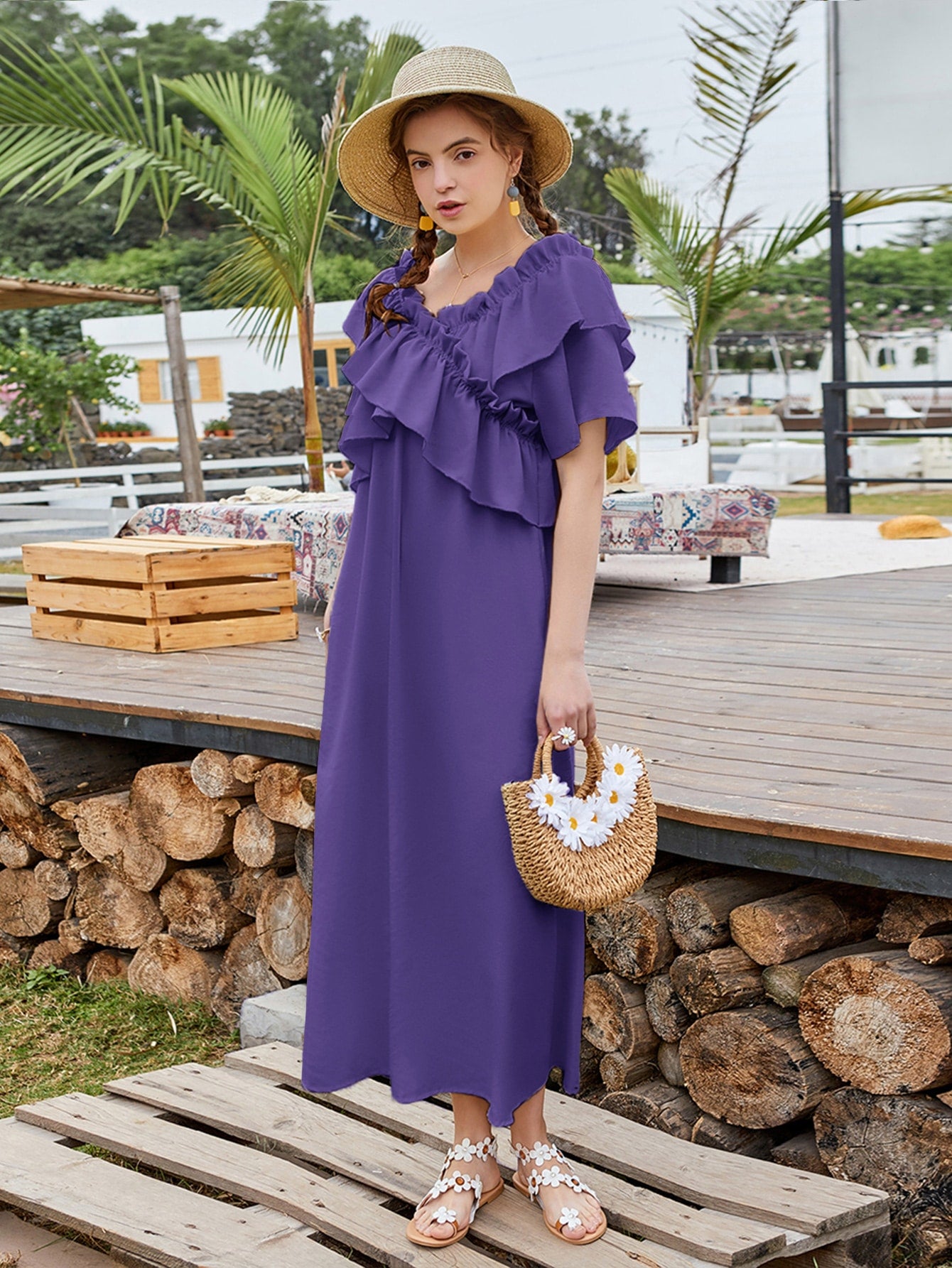 Plain Exaggerated Ruffle Short Sleeve V Neck Straight Natural Long Dress