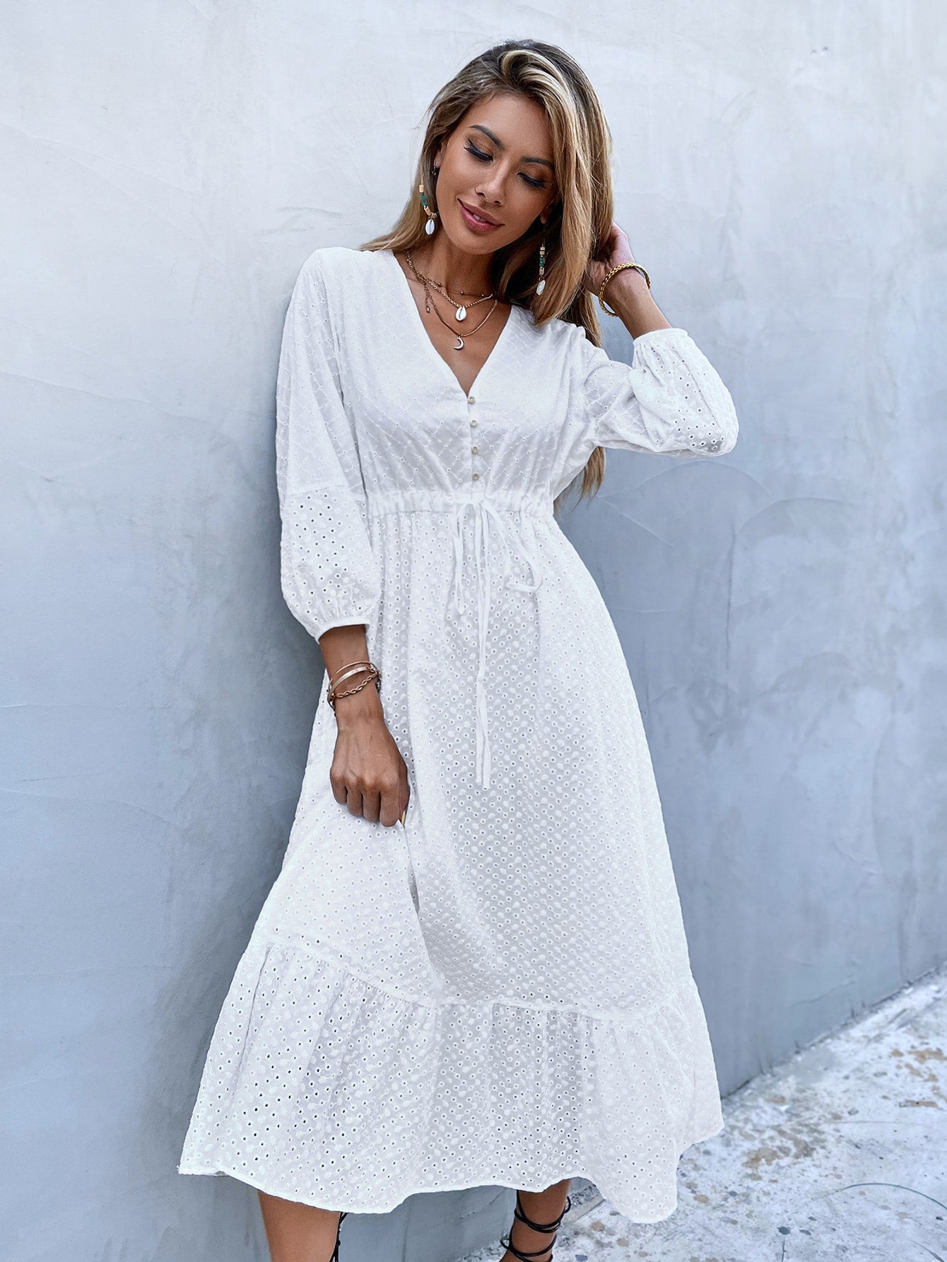 Plain Eyelet Embroidery Three Quarter Length Sleeve V Neck Flounce High Waist Long Dress