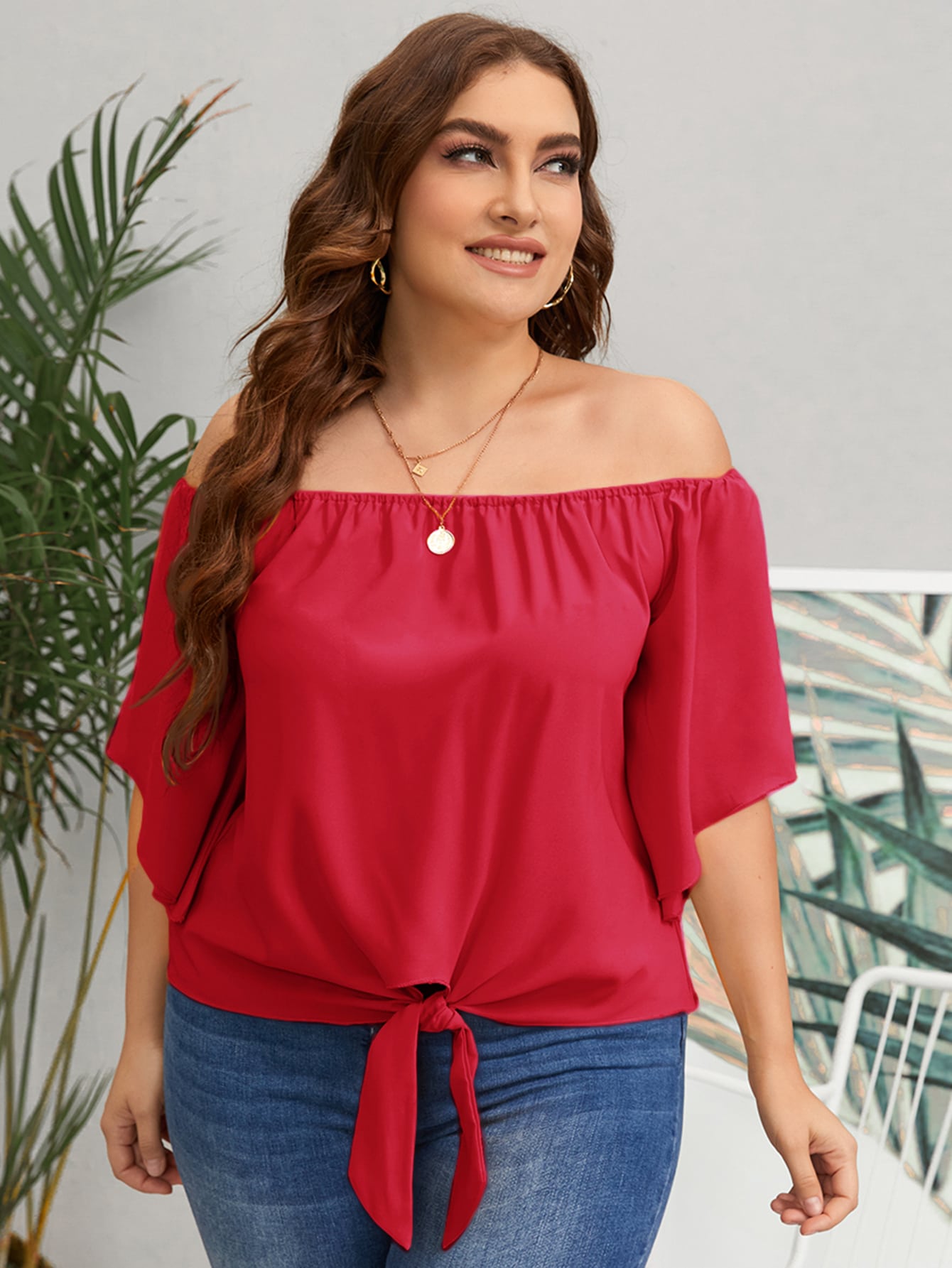 Plain Knot Three Quarter Length Sleeve Off The Shoulder Regular Plus Size Blouse