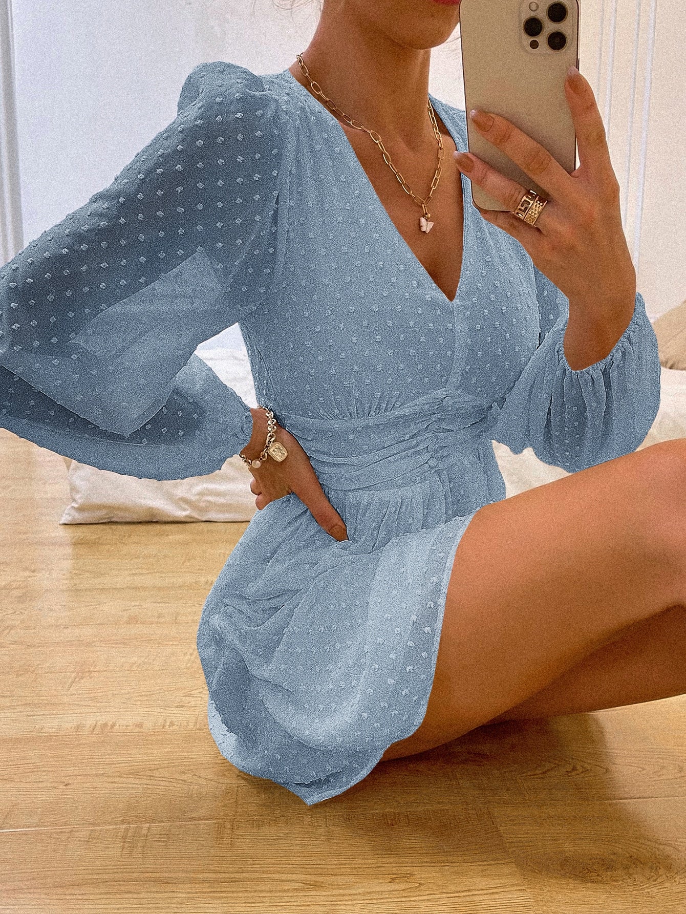 Plain Long Sleeve V Neck Flared High Waist Short Womens Dress