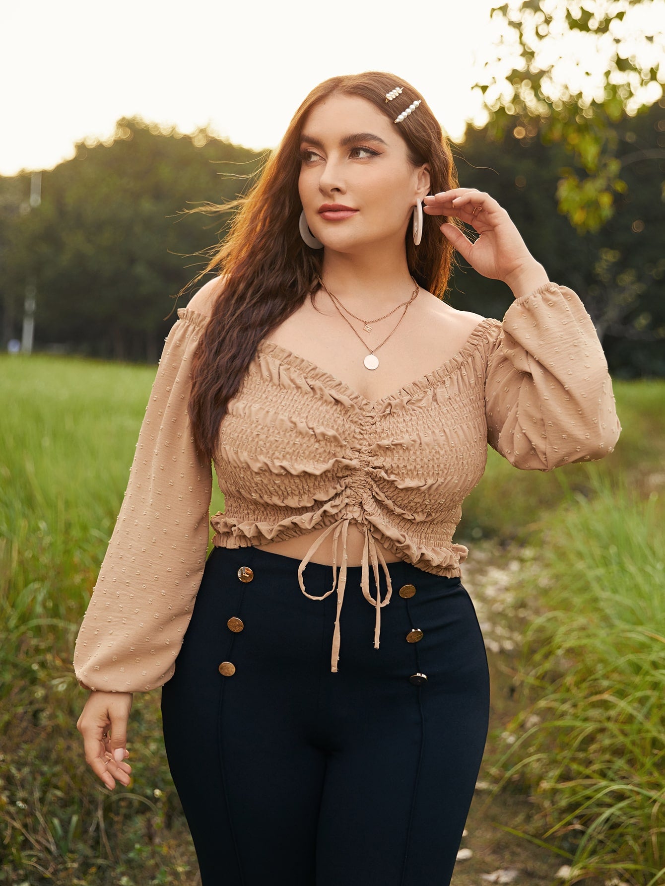 Plain Shirred Long Sleeve Sweetheart Crop Plus Size Blouse